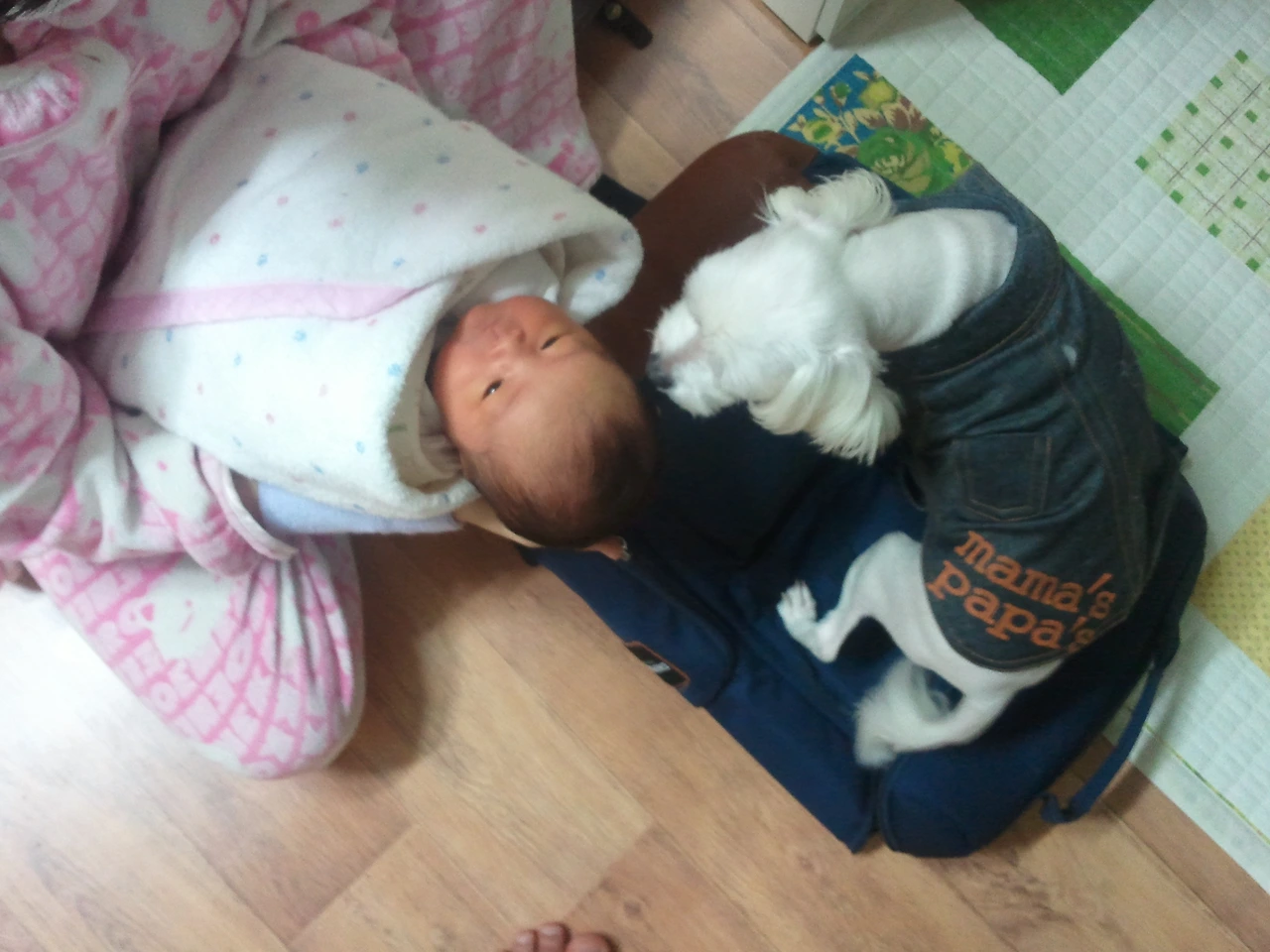 흰둥이와 아기의 첫 만남.