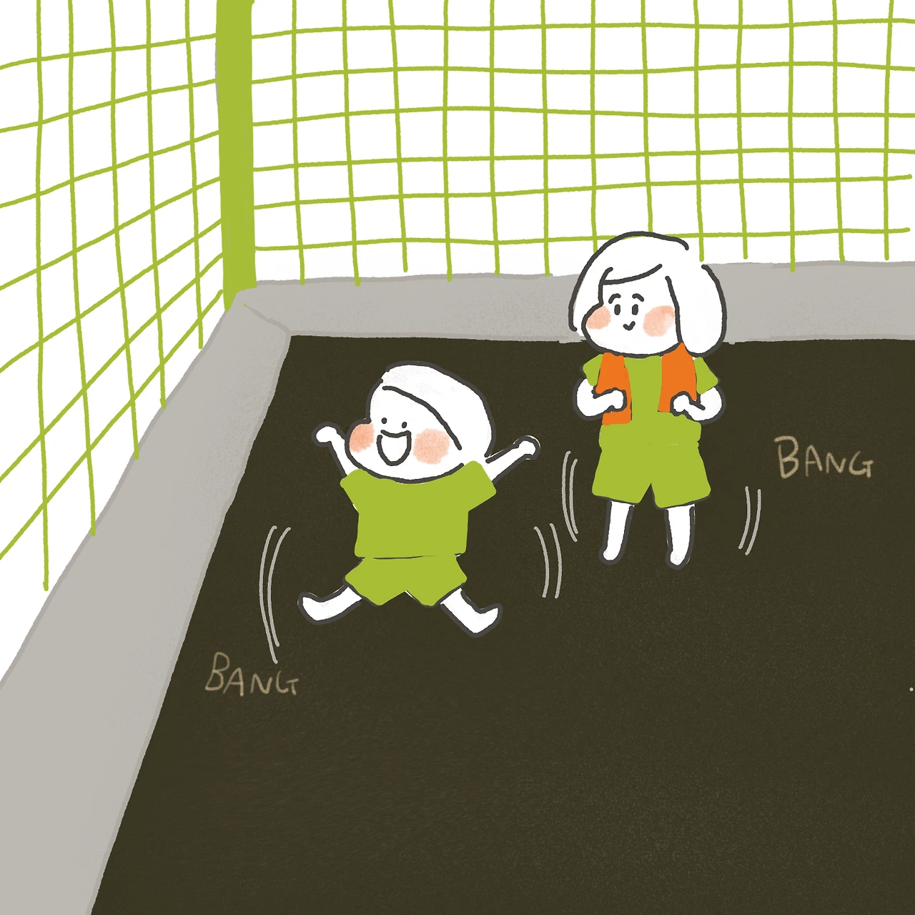 신나게 뛰고 있는 두 아이들 뒤로 순식간에 연두색 찜질복을 입은 아이들이 불어난다.
