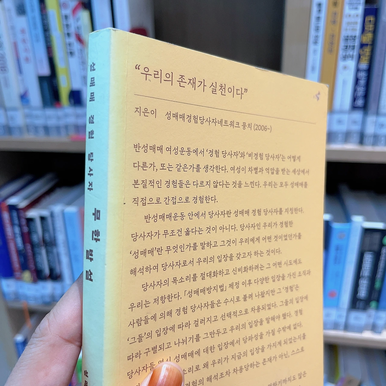 p121 나는 아직도 끝나지 않는 나의 성매매 경험을 재해석하는 과정을, 당사자들과 함께 밟아나가고 있다. 여전히 고민한다. 우리가 왜 그곳에 있었는지, 우리가 왜 그랬어야 했는지, 우리가 선택할 수 있는 것은 무엇이 있었는지, 그런 게 있긴 했었는지. 여러 경험이 여전히 생생하며, 또 누군가는 나의 과거를 현재로 살고 있다.