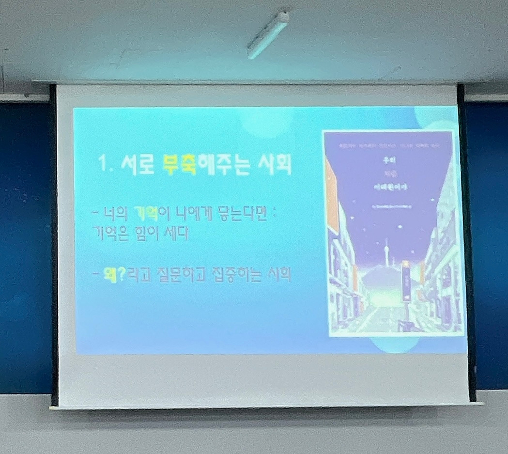 이한빛 피디의 사망 이후 사건을 공론화할 때, 많은 청년•시민들의 연대가 있어 가능했고, 함께 싸운 힘으로 가능했다. 불쌍하다는 동정을 넘어 연대였기에 가능했다. 마무리로 <우리 지금 이태원이야> 이야기를 하시며 ‘서로 부축해주는 사회’에 대해 이야기하셨다. 안 됐다, 에서 그치는 것이 아니라 함께 걸어가는 것. 부축하며 나아가는 것. 그리고 함께 기억하면서 안전한 사회를 만들어가는 것. ’왜?라고 질문하고 집중하는 사회‘를 내가 함께 만드는 것. 그 ’왜‘를 나의 것으로 품고 적극적으로 질문하고 적극적으로 집중하며 살아가는 것.