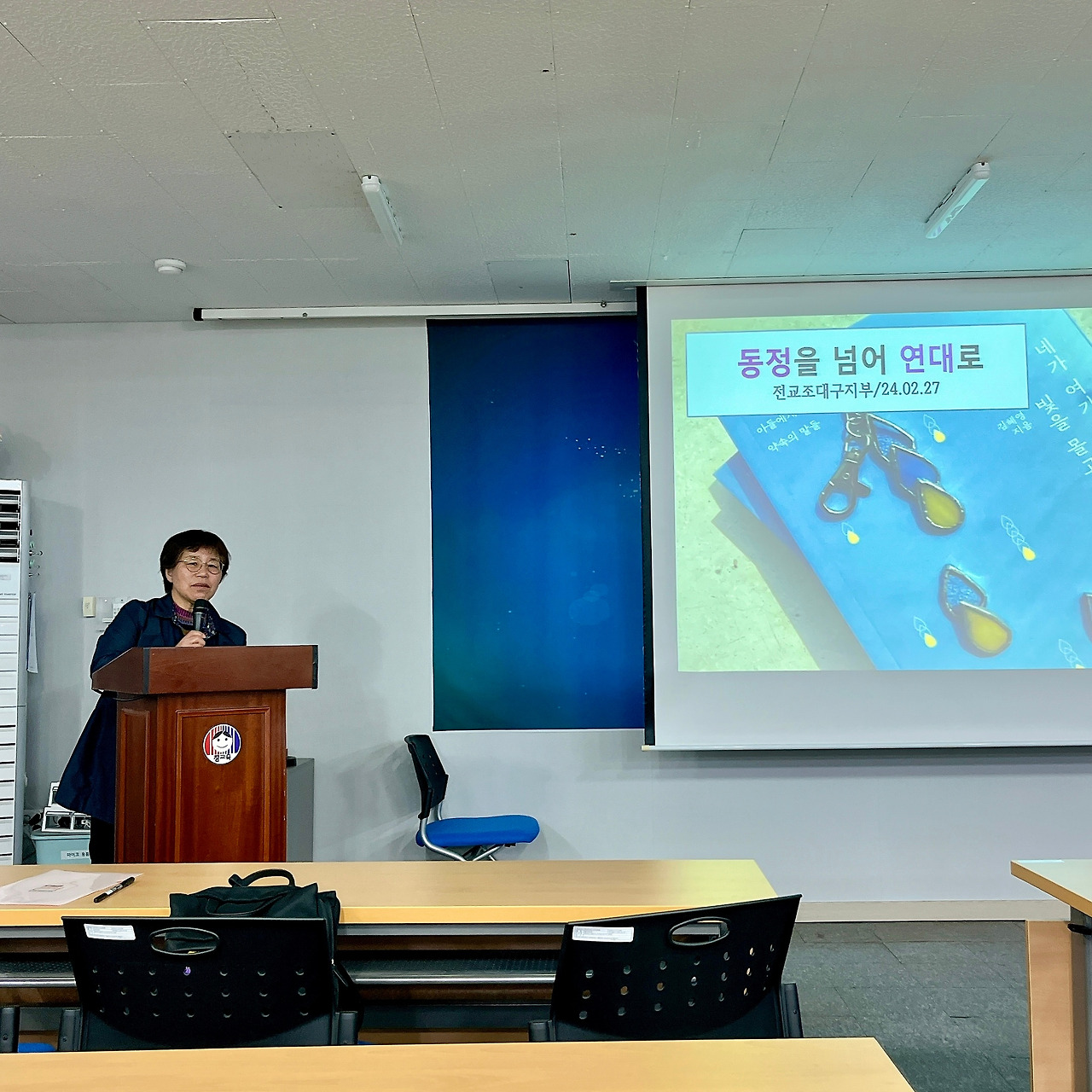 퇴직 교사이자 전교조 전 조합원으로서 힘들게 활동했던 노조 생활의 이야기와 더불어 그에게는 ‘유가족’이란 정체성이 있었다. ‘가족’이 아닌 ‘유가족’이 된 김혜영은 ‘동정을 넘어 연대로‘란 강연 요청 주제에 마음이 갔다고 했다. (이것은 그가 인터뷰한 증언에 나온 이야기이기도 하다) 전교조 연수 일정 중 마지막 전체 일정이으로 교사가 아닌 누구나에게 열린 행사로 진행되었으나, 나 외엔 교사가 아닌 사람은 아무도 없는 행사였다. 성격이 성격인지라 역시 주된 흐름은 교사였던 사람이 교사인 사람들에게 공감과 동의력을 구하고, 확산하고 싶은 이의 강연이었으나 비교사인 나에게도 무리는 없는 시간이었다.
