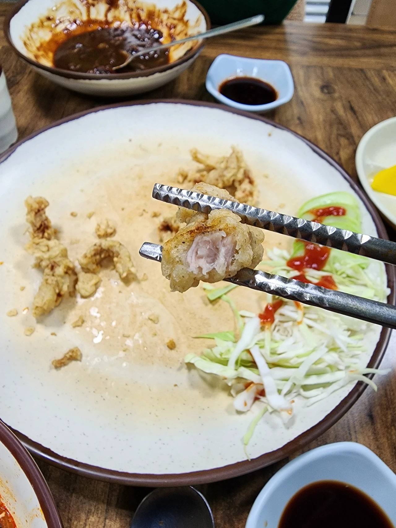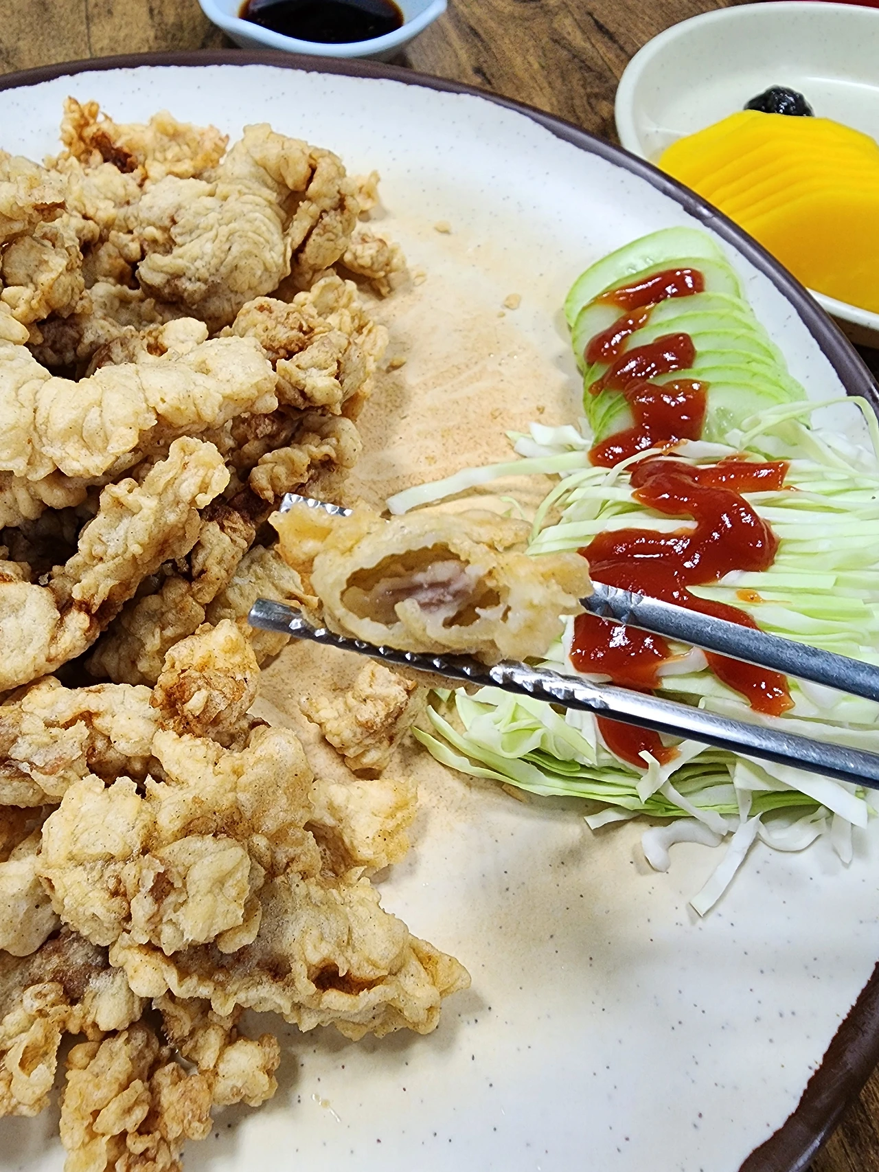 노릇노릇하고 누르스름한 튀김옷 사이로 거뭇거뭇하게 잘 튀겨져서 익혀진 돼지고기가 보였다. 여기까지만 해도 우리가 으레 알고 있는 어느 중화요릿집에서나 먹을 수 있는 탕수육의 고기튀김이라고 생각했다.