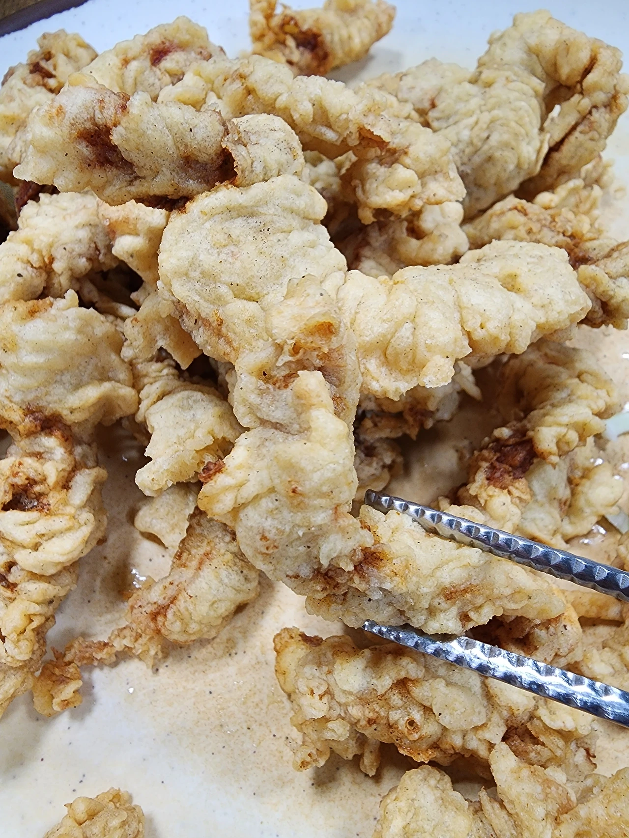 나의 눈이 순간 번쩍 뜨이며 턱의 저작운동은 급격히 빨라진다. 고기튀김을 씹으면 씹을수록 부드럽고 쫄깃한 살점의 식감, 세상에. 튀긴 돼지고기가 이렇게 맛있을 일인가, 그냥 단순하게 튀기 돼지고기처럼 보이는데 이거 왜 이렇게 맛있냐.