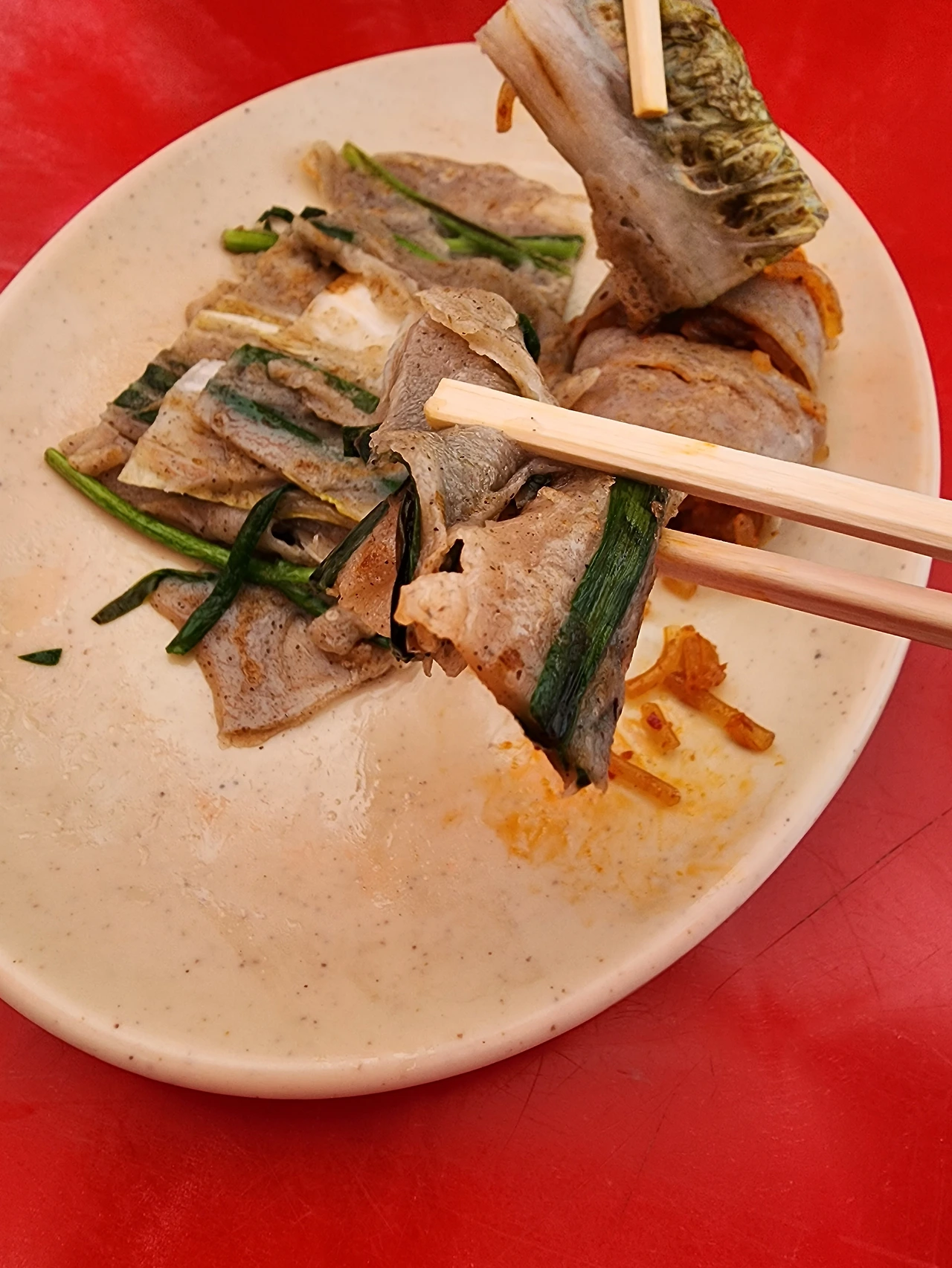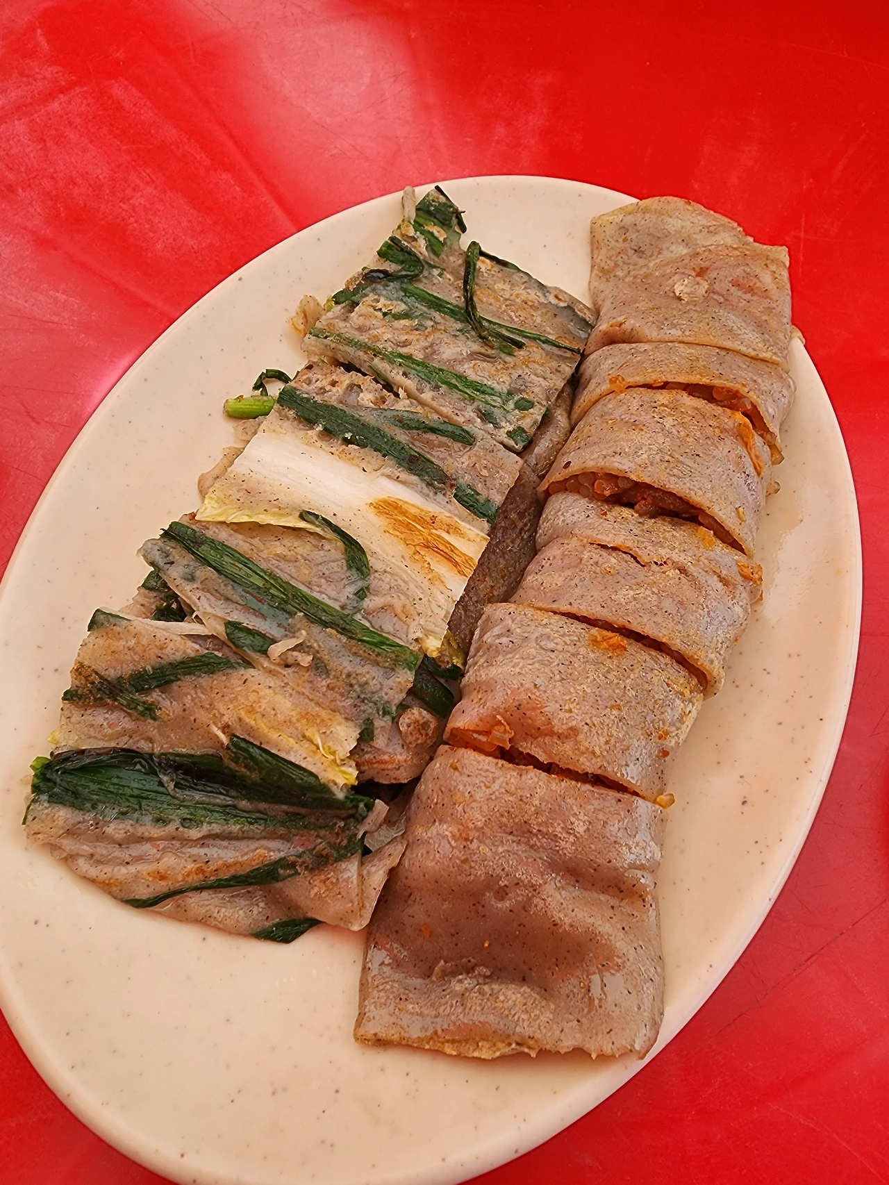 이전에 작성되었던 블로그 글들과 비교를 했을 때에, 우리가 판단하기로는 배추전과 해장국을 팔고 있는 실내 포장마차에서 이제는 5일 장날에 배추전은 팔아도 순대국밥은 팔지 않는 것으로 보였다. 아쉬운 마음에 잠시 허기도 달랠 겸 배추전과 메밀전병(혹은 '총떡'이라고도 부른다)을 시켜 먹는다. 갓 구워져 나온 메밀반죽에 노릇하게 구워진 배추전은 바삭하고 쫀득하다. 아, 그 전설의 순대국밥을 먹지 못하여 아쉽다는 생각이 든다.