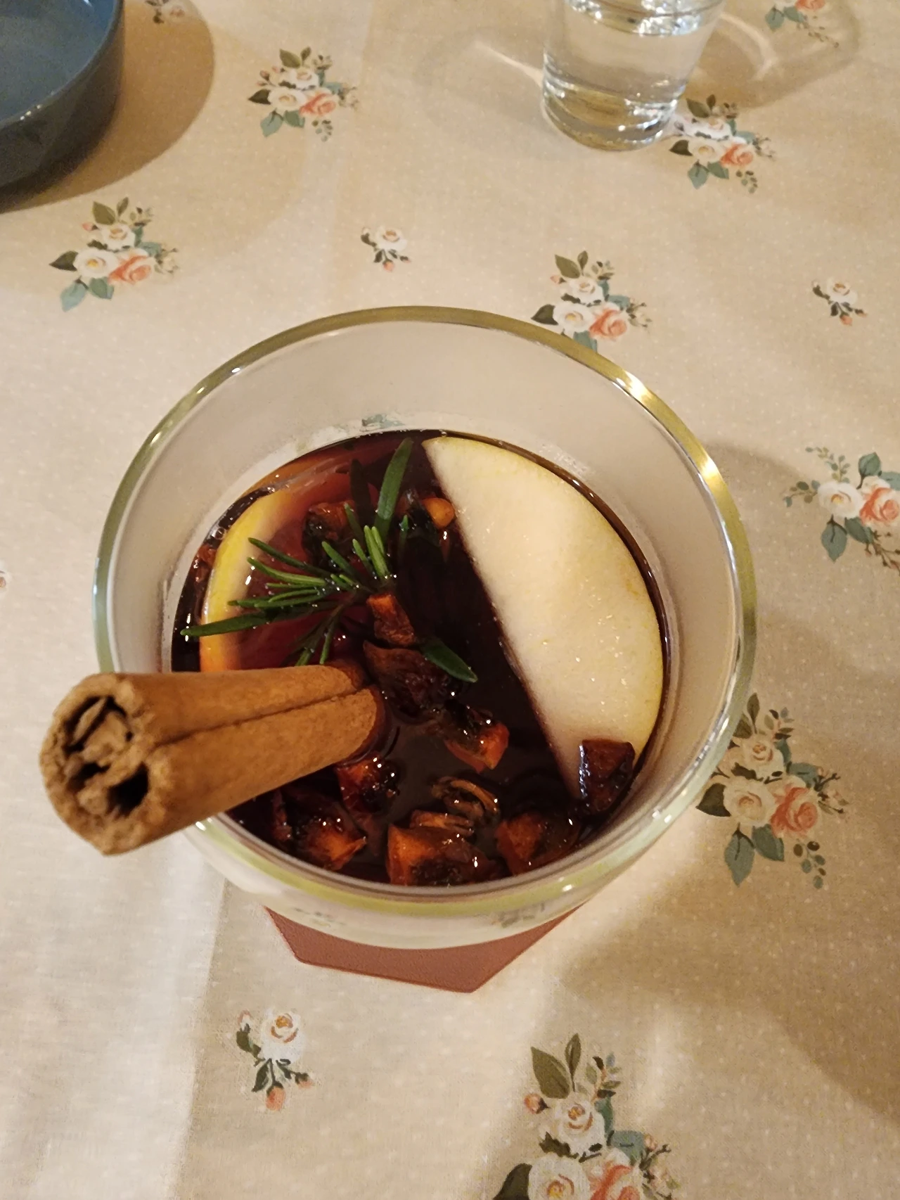 에몽데의 무알콜 레드와인 뱅쇼. 시나몬스틱, 사과, 레몬, 팔각 등의 향신료가 가득하다.