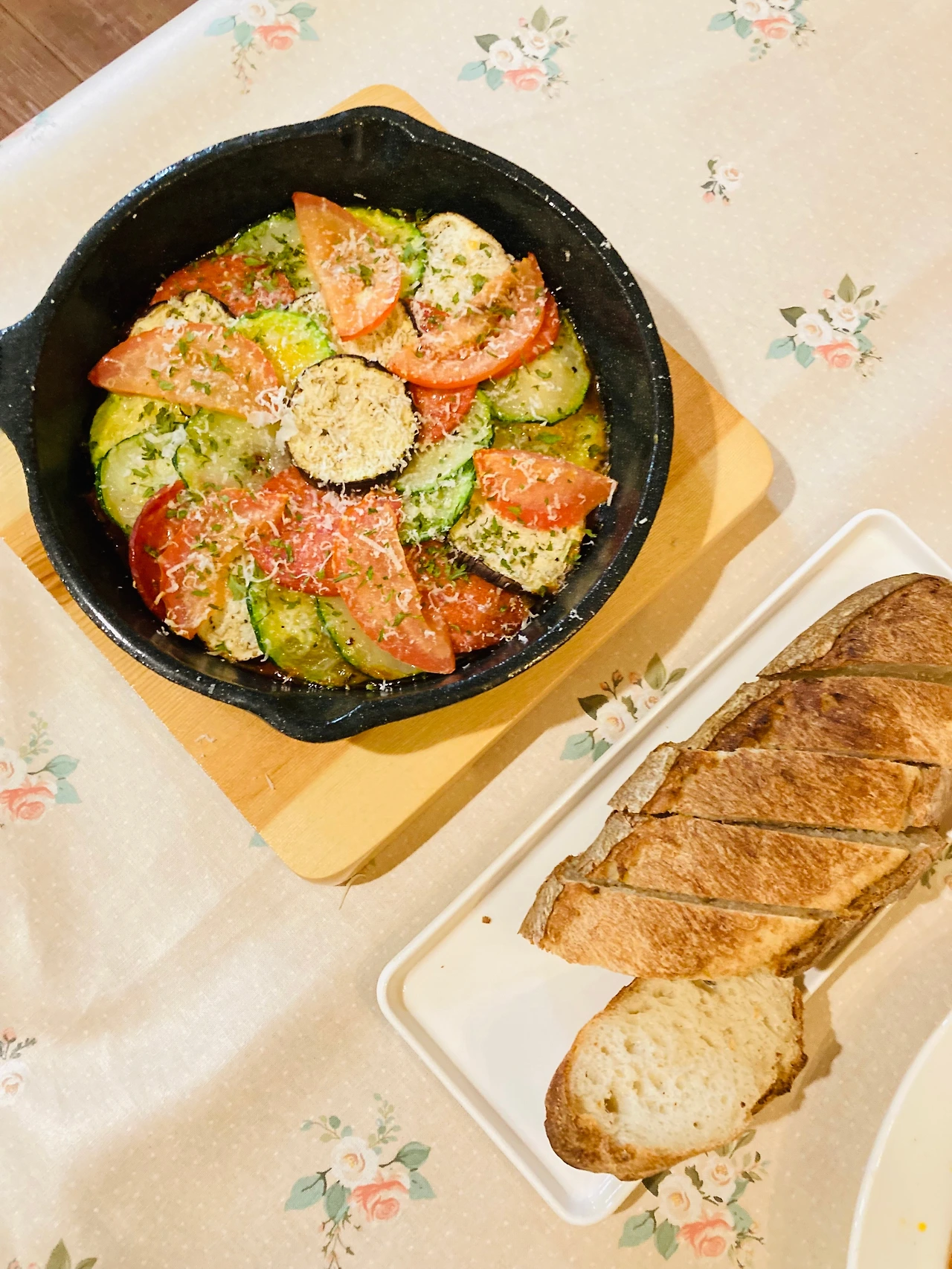 "라따뚜이 나왔습니다~ 무쇠팬이 뜨거우니 손 조심하세요. 이 바게트는 쌀바게트예요, 라따뚜이를 올려서 같이 드셔보세요. 가지구이와 양송이구이도 곧 서빙할게요."