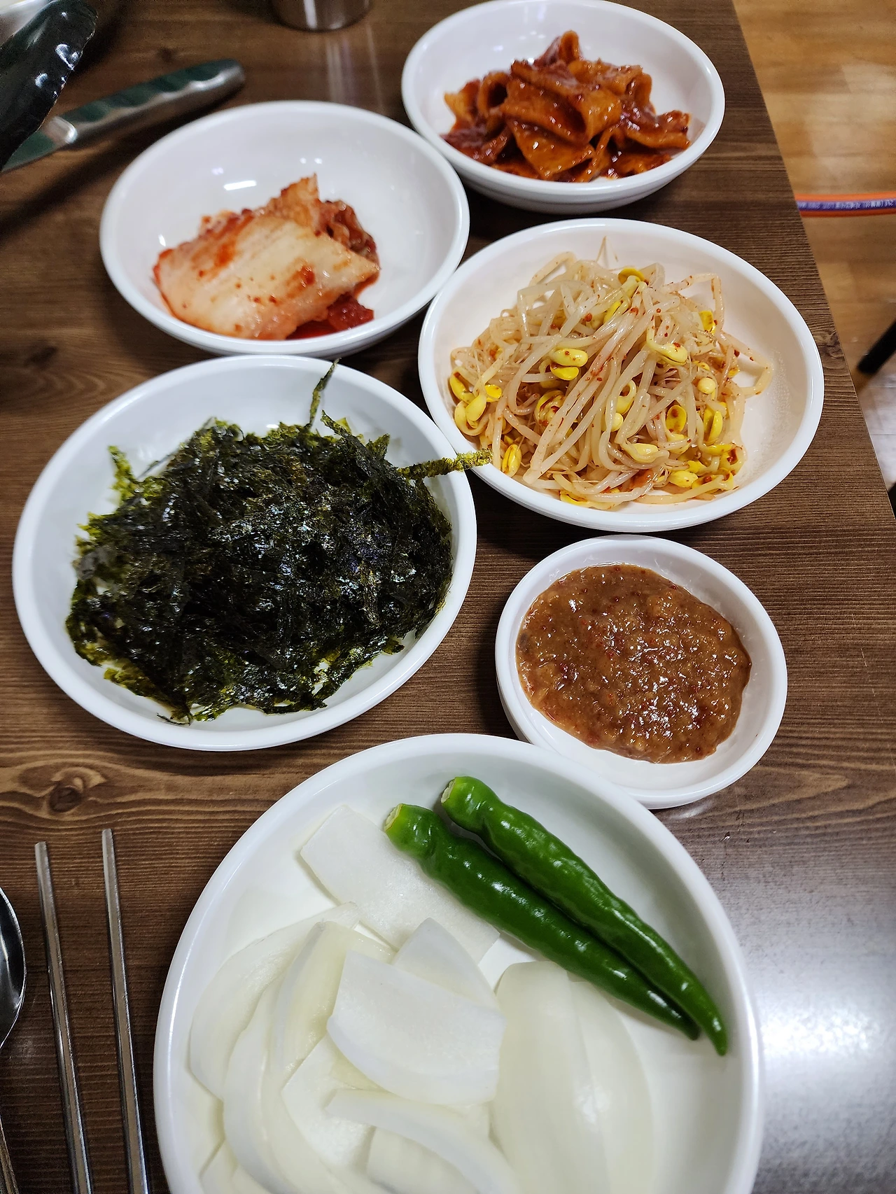 평을 남겼을 정도로 가성비와 솜씨가 좋은 동네 밥집이니 그 이상의 큰 기대를 갖고 오지는 말라는 느낌이었다. 그래서 나도 그랬다, 돼지찌개라는 이름을 가진 음식을 하는 곳은 많지 않으니 경산에 온 겸, 한 번 먹어보고 싶은 마음으로 이쁜 여자를 데리고 들어갔다. 나도 집에서 돼지고기와 고추장을 넣은 찌개를 많이 하는 편이라, 식당에서 파는 돼지찌개는 어떤 맛인지 궁금하기도 했고.