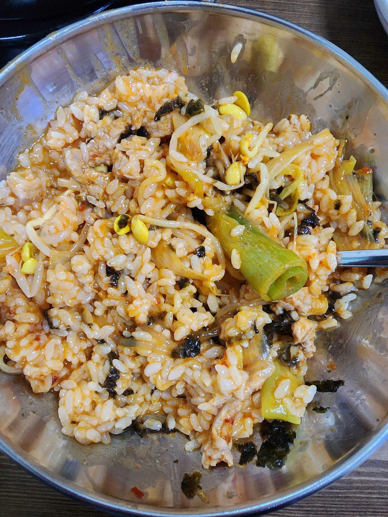 나와 이쁜 여자는 각자 국자를 들어 대파와 건더기를 듬뿍 밥에 덜고는 고춧가루에 버무려진 콩나물무침과 김가루를 넣고는 사장님께서 알려주신 대로 슥슥 비비기 시작한다. 돼지찌개로 만든 비빔밥이 많이 뻑뻑하니 국물을 더 넣어 조금 더 질퍽한 질감의 비빔밥으로 만들어본다. 그리고 한 숟갈 크게 떠서 입안으로 가져간다.