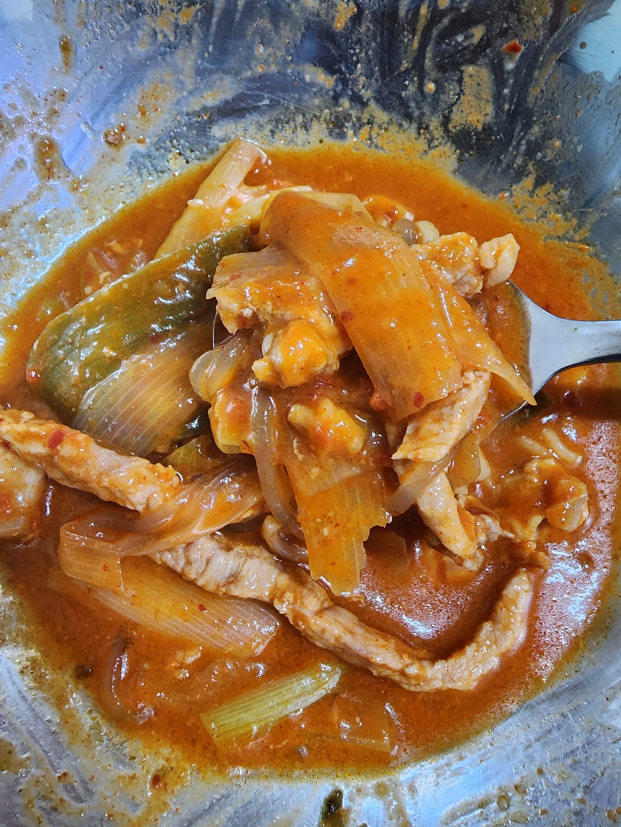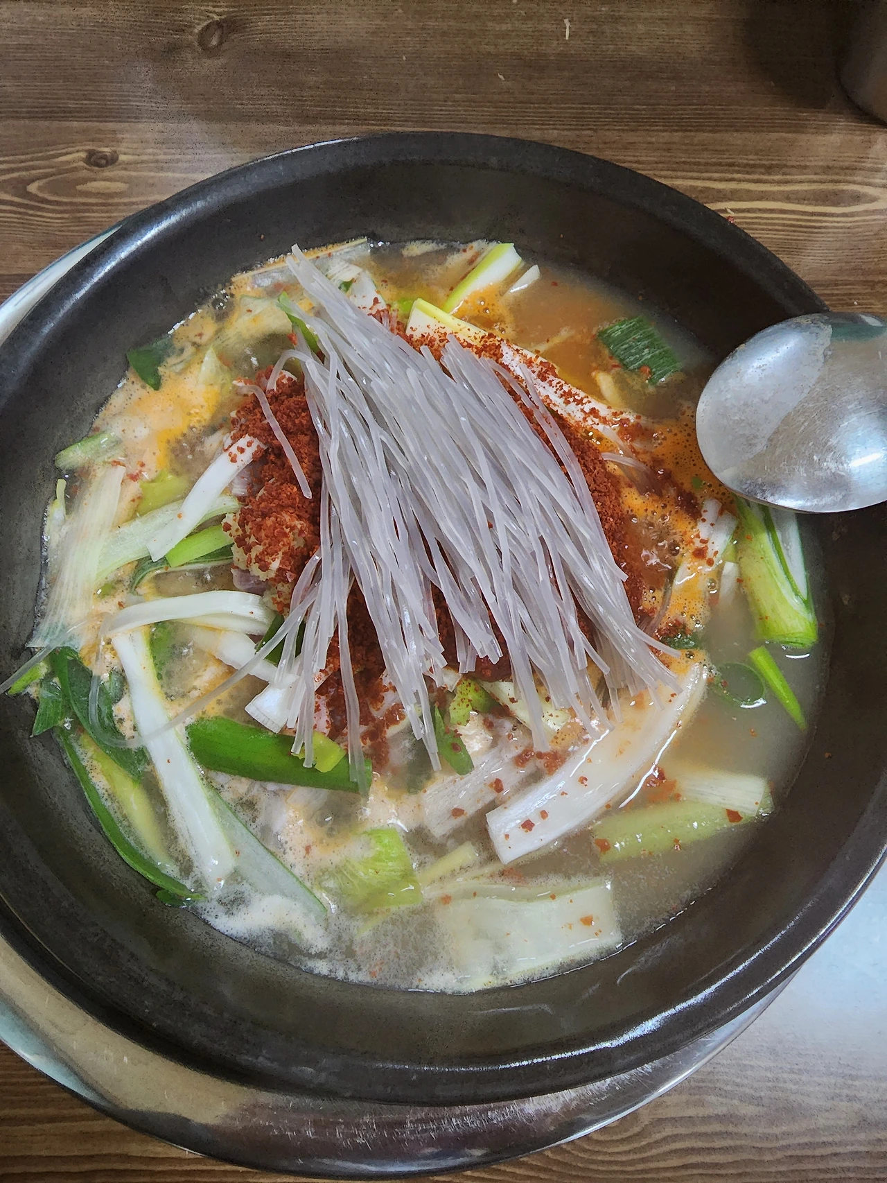 찌개에 들어간 건더기들을 조금 더 자세히 살펴보니 돼지고기, 마늘, 대파, 당면, 끝. 양념장이나 세세한 고춧가루 등을 제외하면 많은 재료가 들어가는 것이 아닌데 이 맛있는 훌륭한 쿼텟이 서로 매콤함, 단맛, 감칠맛으로 어우러진 호흡을 맞추며 즐거운 풍미를 뽐내고 있었다.