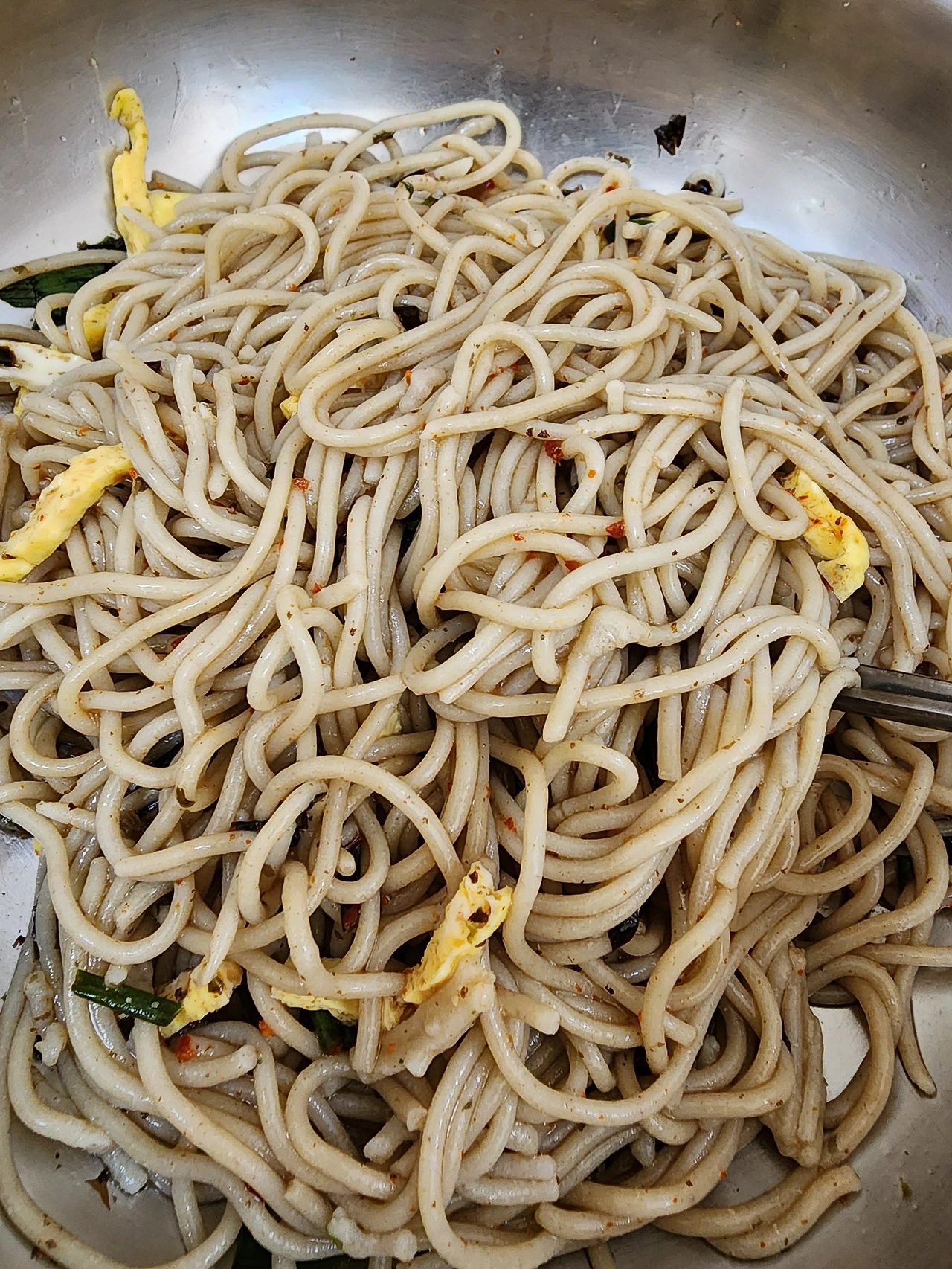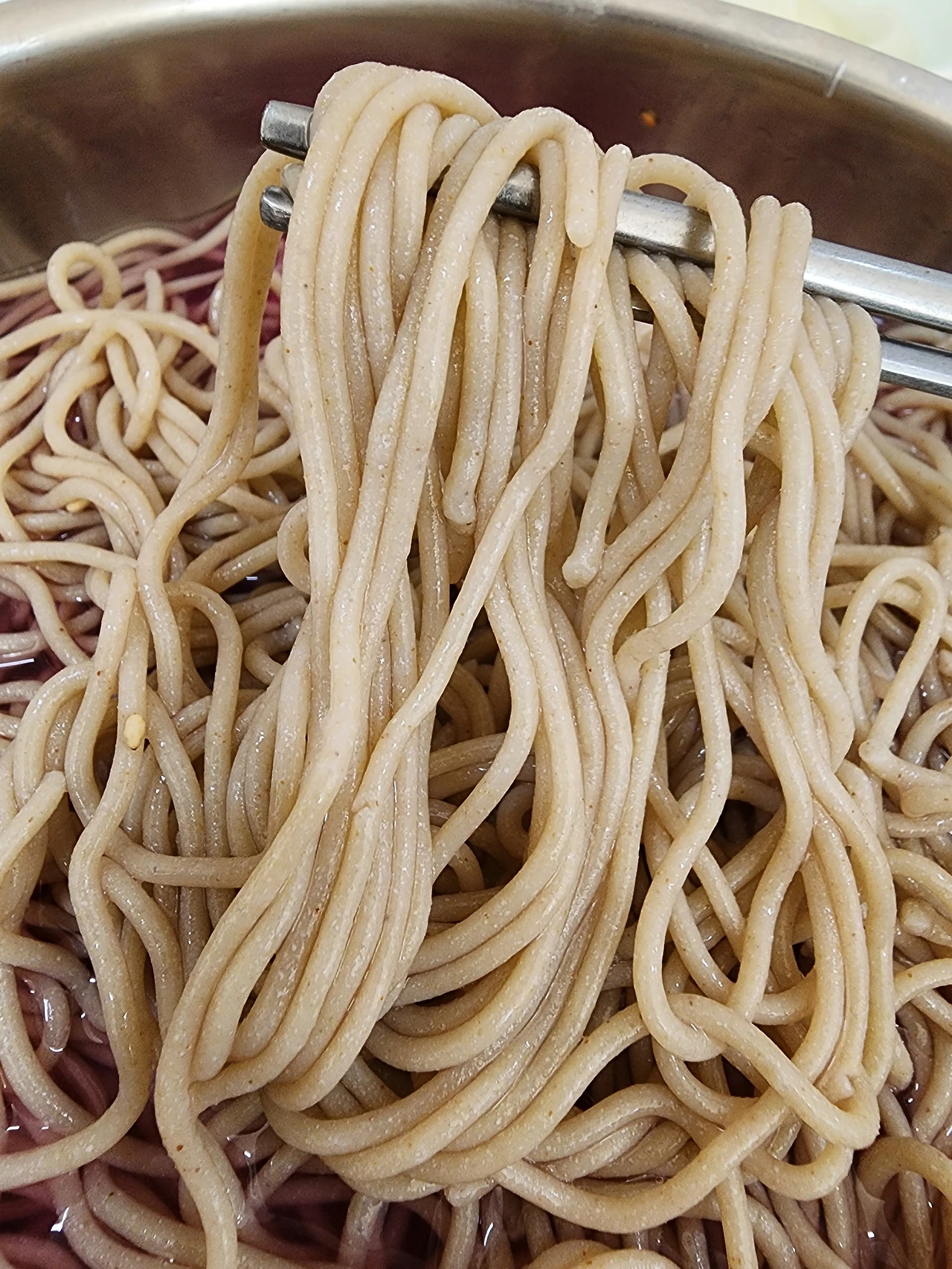 젓가락으로 잡아서 올려본다. 찰기가 없다, 찰랑거리기보다는 덜렁거리면서 툭툭 떨어지는 모양새다. 착착 감기지도 않고 입안에서 슬슬 넘어가는 부드러운 면발도 아니다.