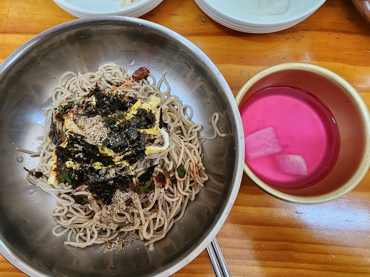 조금씩 배가 차는 느낌이 들지만 하늘이 맑아지는 동치미를 나는 한 방울도 놓치고 싶지 않다. 스테인리스 면사발을 한 손으로 잡아 들고 입으로 가져간다. 보랏빛 하늘맛의 동치미를 흡입하면서 젓가락으로는 툭툭 끊어져있는 면발을 슥슥 긁어먹는다. 마침 사장님께서 비빔국수를 가져오시며 그 모습을 보며 함박웃음을 지으신다.