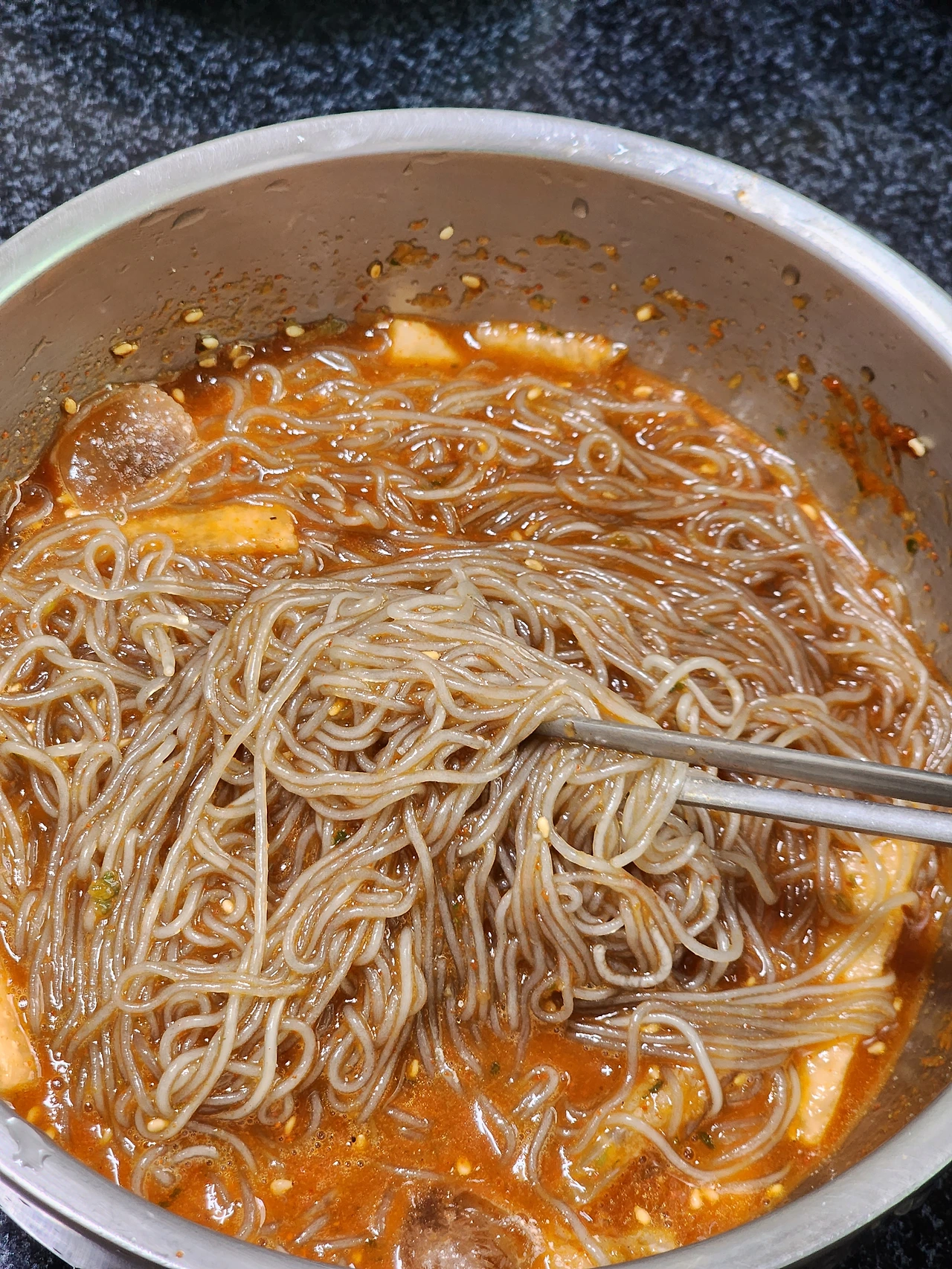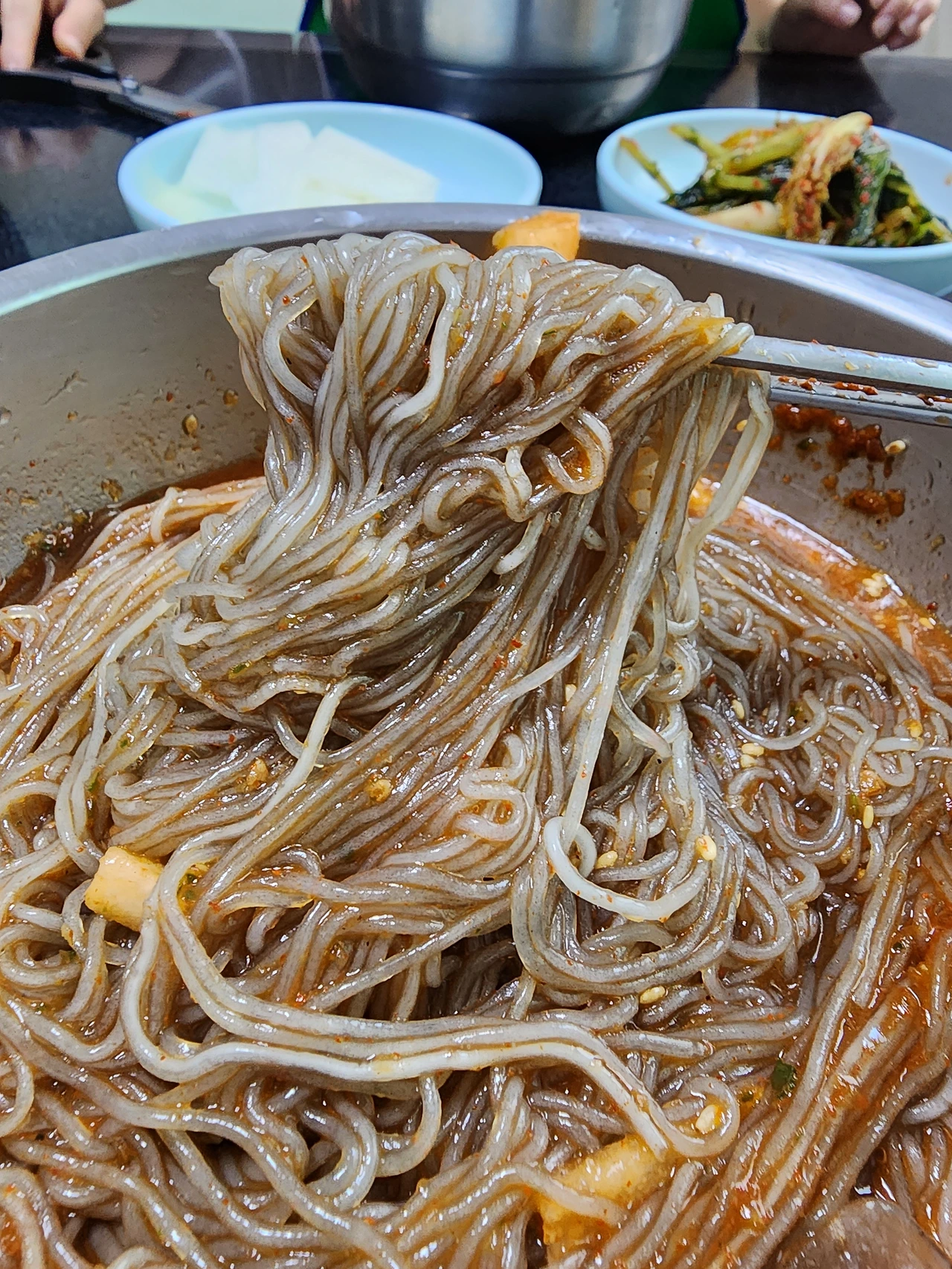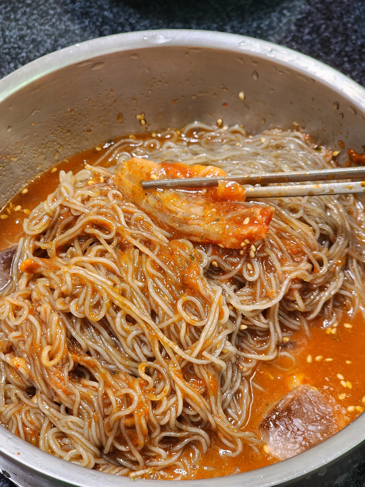 일반적으로는 위에 올려놓은 꾸밈과 면을 잘 섞어서 간을 맞춰 먹어야겠지만 가오리식해가 너무 맛이 좋았던 탓에 그러지 않았다. 그래서 우리는 면에 묻어있던 기본적인 양념만으로 면을 섞어서 면에 간을 묻혀본다. 사장님께서 식탁 한 편에 두고 가신 육수주전자에서 육수를 자작하게 부어서 매끄럽게 섞는다. 그리고 한 젓가락.