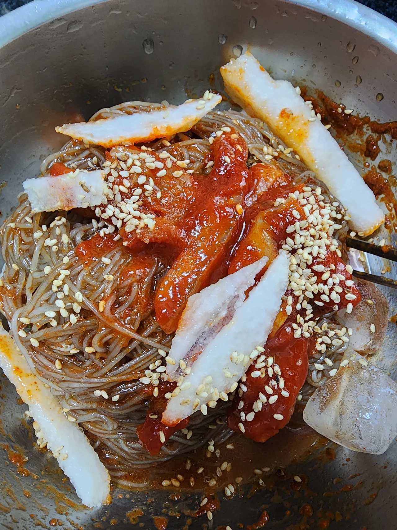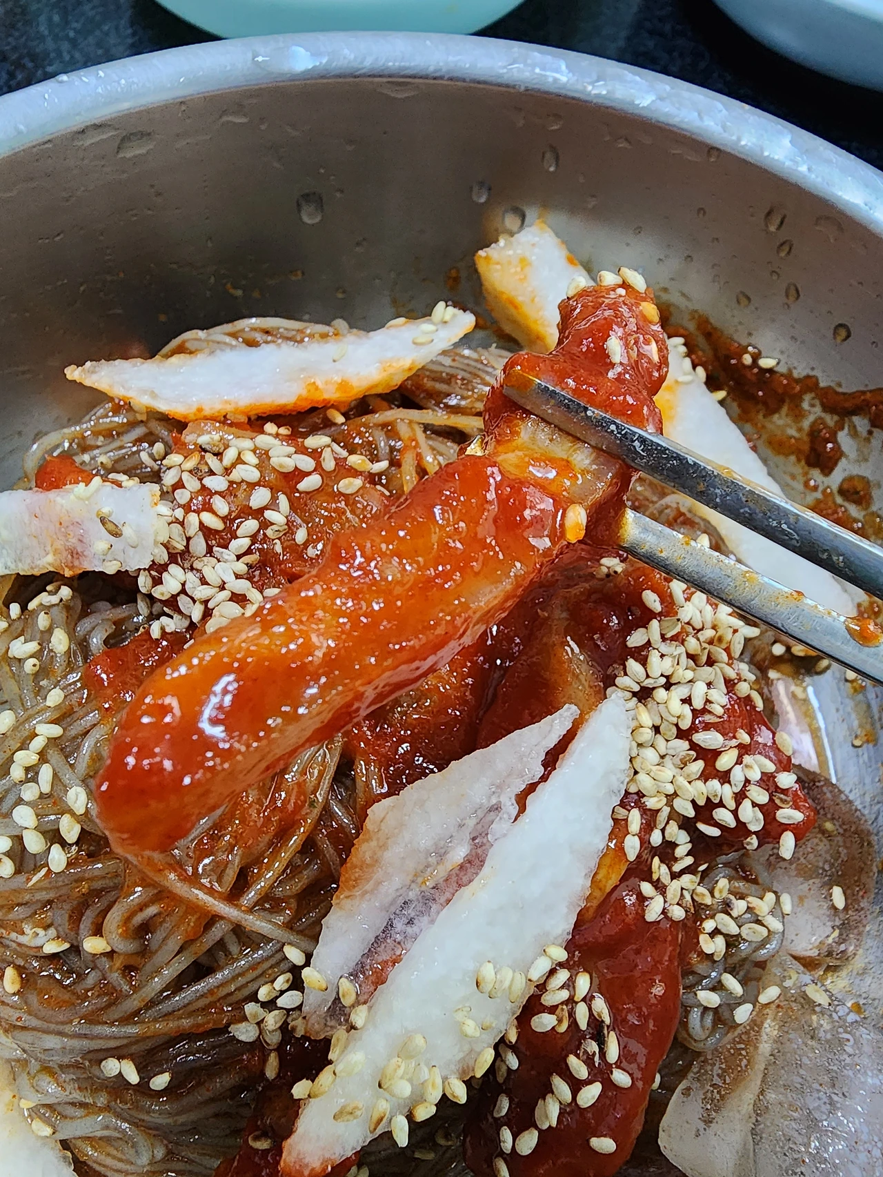 제일함흥냉면의 비빔양념은 매우 온순하고 자극적이지 않은 맛이다. 극적으로 달달하거나 짭짤하지 않다, 하지만 묘하게 감칠맛이 폭발하고 고소한 맛이 코끝까지 올라온다, 거기에 자연스러운 달콤함에 찰지고 쫄깃한 면발의 식감이 빈칸을 채운다. 달콤하거나 짭짤한 맛이 거의 없는데 이거 왜 맛있지? 양념을 한번 떠먹어본다.