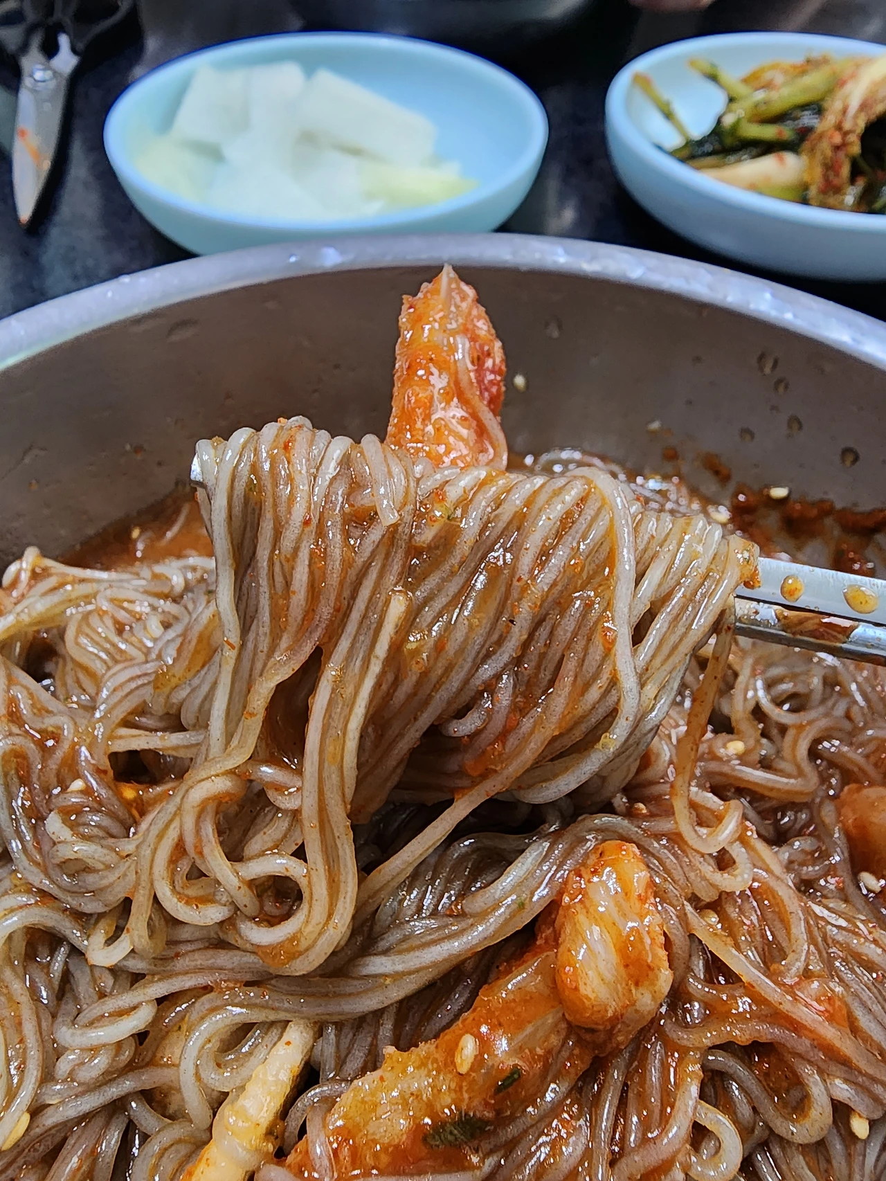 우리 앞으로 커다란 스테인리스 사발 안에 커다란 냉면 똬리가 붉은 고명조각을 머리에 쓰고 등장한다. 달착지근하고 고소한 냄새가 코를 찌르듯이 올라온다, 이미 냄새만으로도 군침이 돌기 시작했다. 면은 거뭇거뭇하면서도 투명한 회색과 흰색이 섞인 것을 봐서는 고구마, 감자 등의 가루로 뽑아져 나온 것으로 보였다. 실보다 약간 더 두꺼운, 하지만 함흥냉면식대로 가느다란 면발들이 우리들의 인연만큼이나 얽히고설켜 둥글둥글하게 자리를 잡고 있었다. 그 위에는 두툼한 손가락 같은 무언가가 반투명한 살과 껍질을 반짝이며 붉은 양념을 입고 있기에 궁금했다.