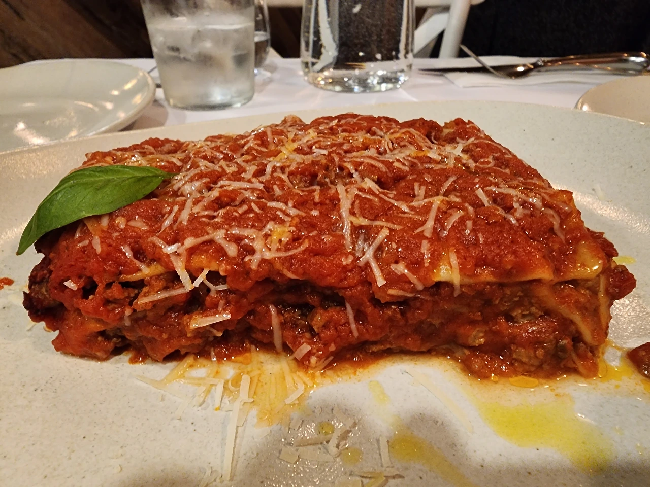그리고 우리의 식탁에 먼저 등장한 것은 라자냐, 두꺼운 종이와도 같은 두께의 라자냐면이 3겹 정도로 쌓였고 그 위에는 잘 익은 토마토처럼 새빨간 토마토 라구소스가 듬뿍, 라자냐면 사이에도 겹겹이 듬뿍 고기, 치즈와 함께 들어와 있었다. 필자는 라자냐를 상당히 좋아하는 편이라 소프리토와 채수, 육수 만들기부터 시작해서 라자냐 건면을 제외한 소스도 직접 몇 시간을 걸쳐서 요리해서 먹기도 하는데 비용과 시간이 상당히 많이 드는 음식이라 좋아하지만 자주 먹을 수는 없다. 그렇기 때문에 이런 이탈리아 식당에서 나오는 제대로 된 라자냐가 반가울 수밖에. 그리고 나는 숟가락을 들어 라자냐에서 흘러나오는 토마토소스를 먼저 한입.