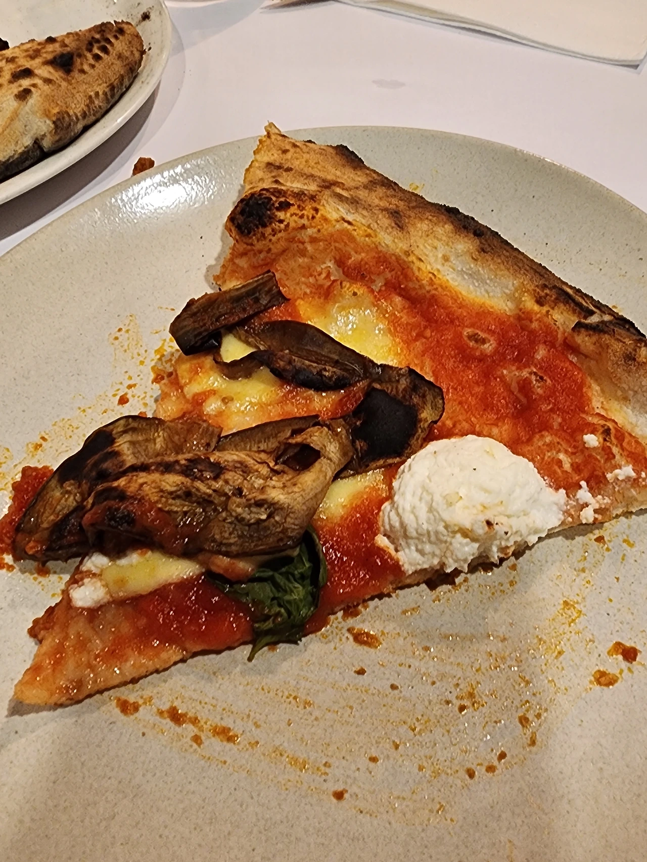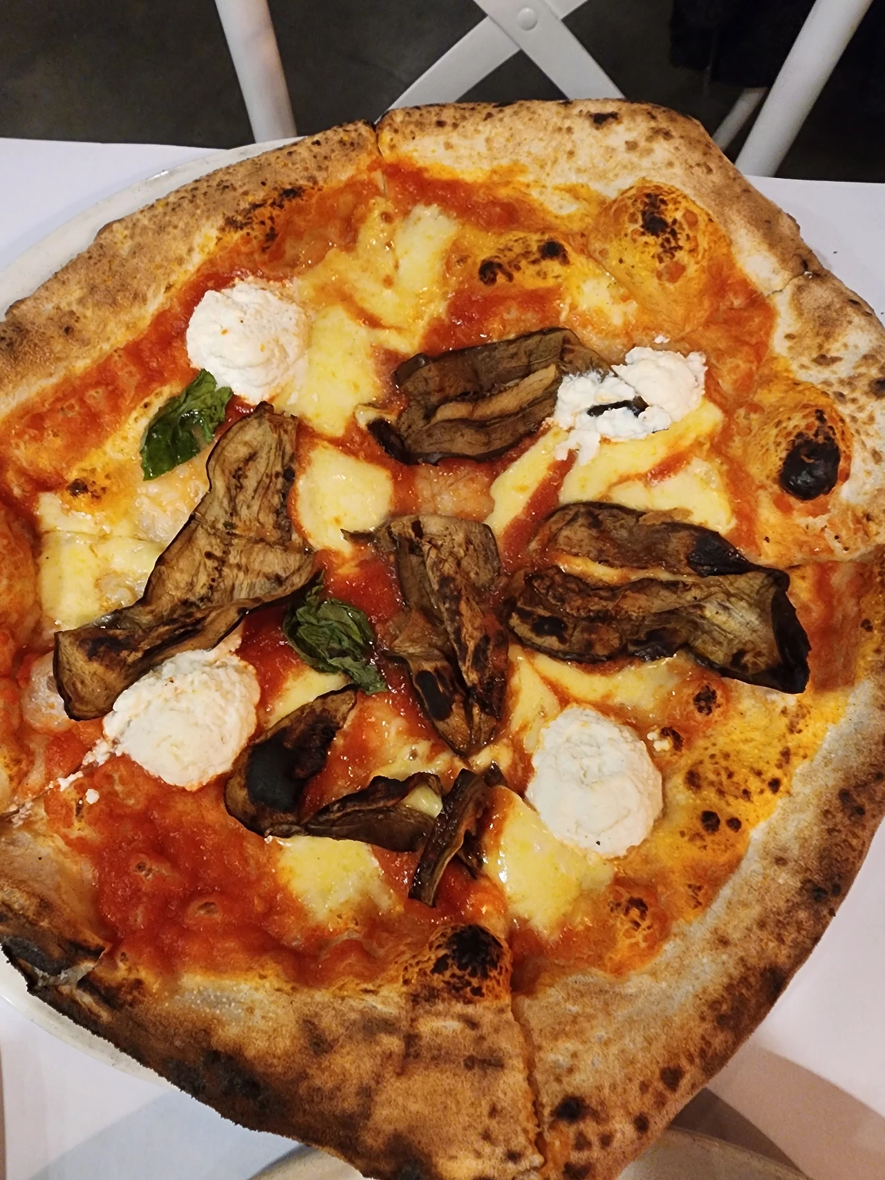 그렇게, 얇지만 바삭하고 끈끈하고 쫄깃한 피자도우는 그 위에 올려진 촉촉한 토마토소스와 어우러지고, 거기에 묵직하며 고소한 유지방의 미끄러지는 맛을 터트리는 리코타치즈가 입안의 한쪽에서 씹힌다, 토마토소스에 얹어져서 구워진 모차렐라 치즈가 유지방의 더 부드러운 쫄깃함을 더한다. 마지막으로 위에 올려진 얇은 가지가 바삭한 껍질과 함께 아삭아삭하게 씹히며 화덕에서 입고 나온 훈연의 풍미를 뽐내어서 피자로부터 뿜어져 나오는 향과 맛이 코까지 뚫고 올라오는 맛.