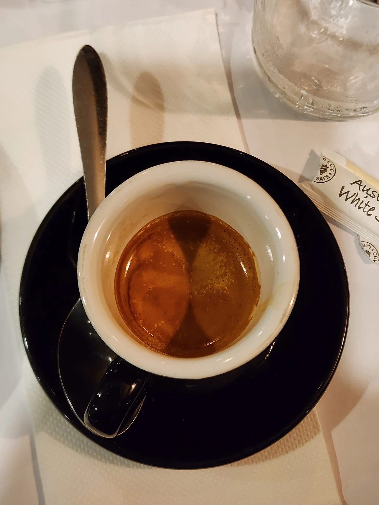 나는 뜨거운 에스프레소에 설탕을 넣고서 재빨리 녹인다, 에스프레소는 뜨거울 때 홀짝거리면서 넘기는 게 좋다.