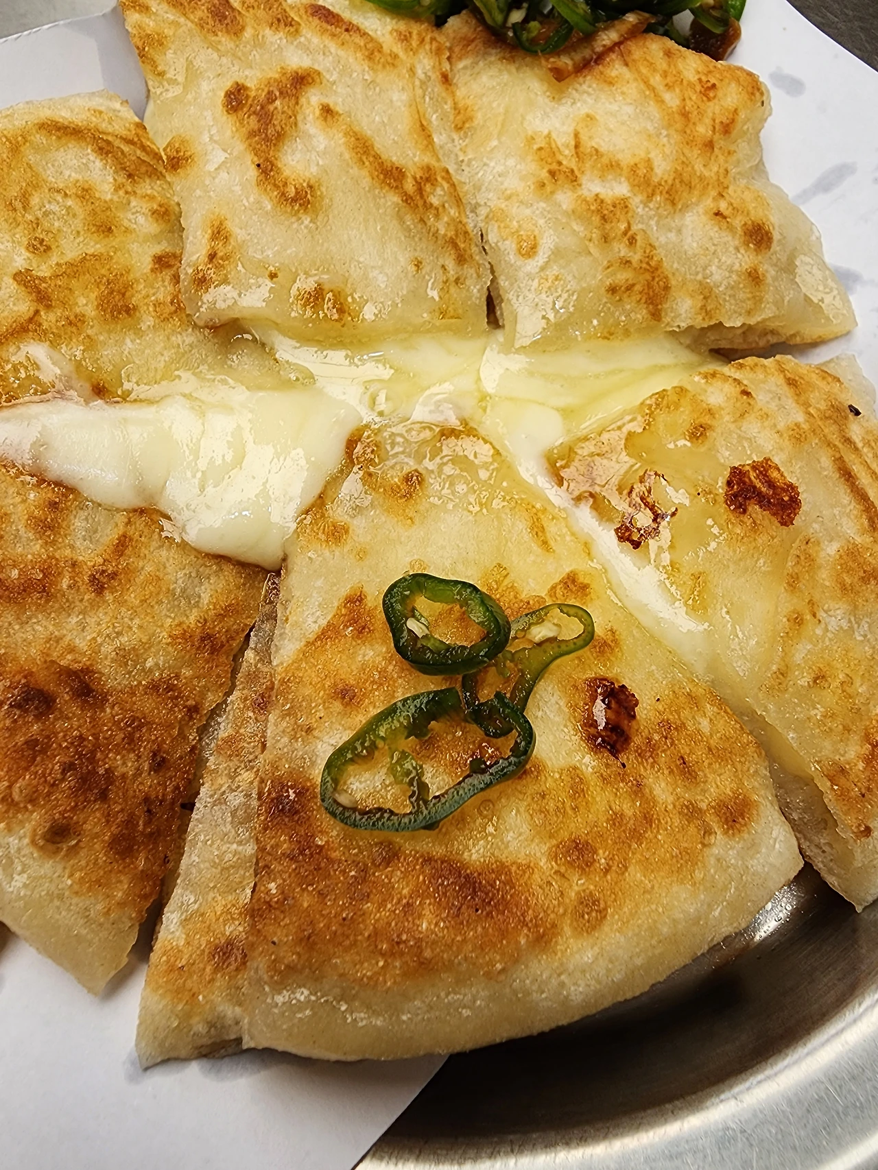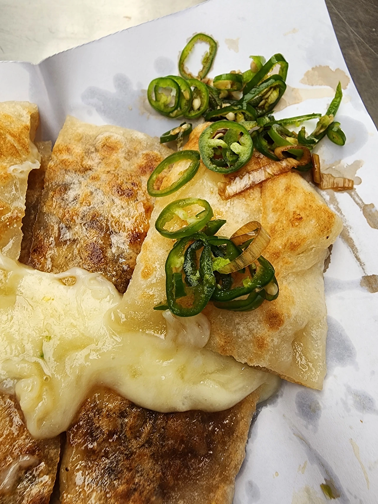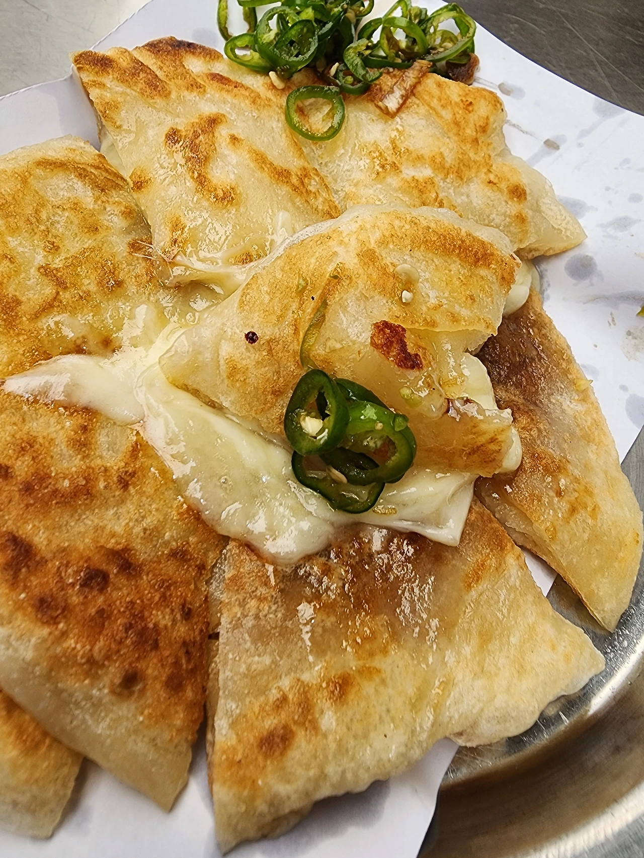 짭짤한 간장의 냄새와 매콤한 청고추의 냄새가 혼합되어서 코를 찌른다, 얇은 호떡피와 달콤한 설탕의 맛에 매콤 짭짤한 땡초절임이라 이미 상상이 되는 맛있는 조합이다. 나는 땡초절임을 치즈호떡과 씨앗호떡이 2층으로 겹쳐져 피자처럼 잘려있는 조각 위에 조금 올려놓고 젓가락으로 밀전병 싸 먹듯이 먹었다.