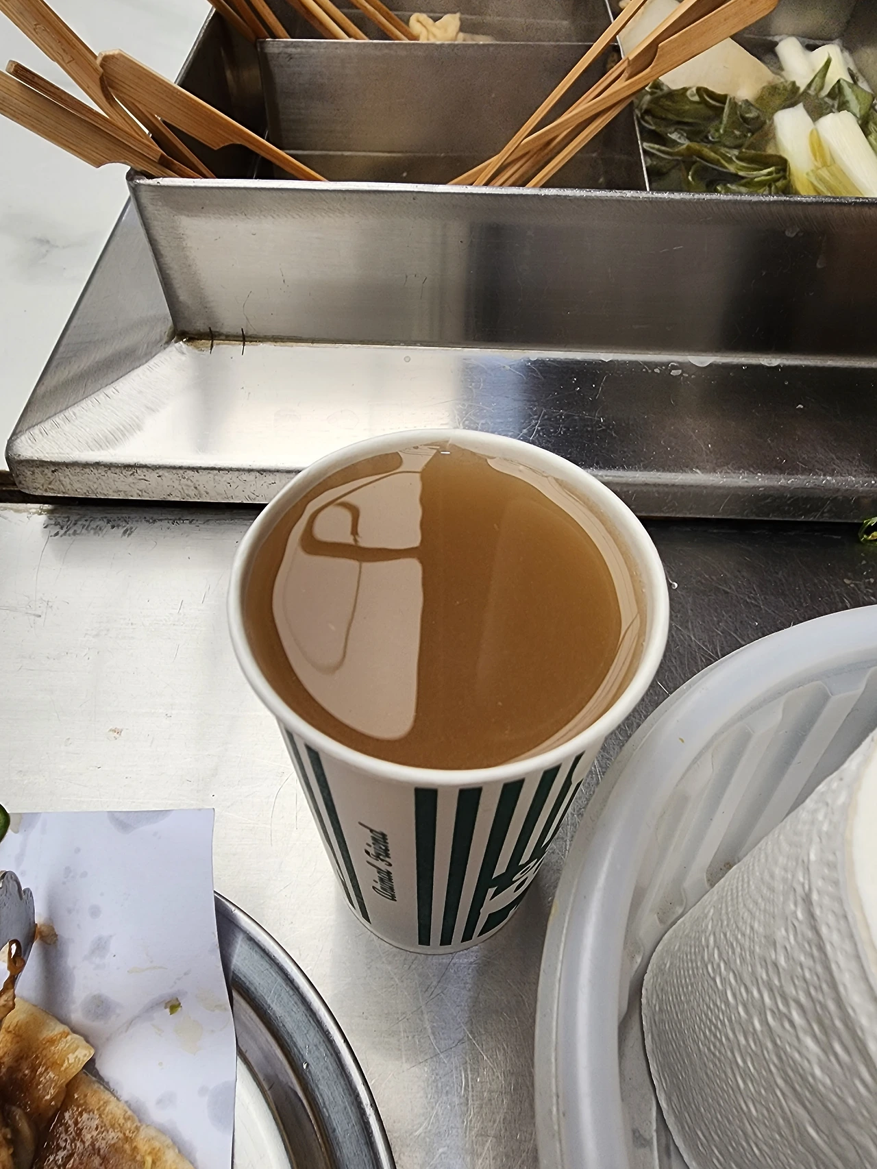 호떡을 먹기 위해서 점포의 스테인리스 간이식탁 모퉁이에 앉자마자 따뜻한 기분으로 밝아지도록 어묵 국물을 먼저 컵에 떠서 주시는 직원분. 그 옆에서 '할매호떡'의 '할매'를 담당하고 계신 어르신 사장님께서는 손님은 안중에 없으시고 계속해서 들어오는 호떡 주문을 신속하게 응대하시는 모습. 내가 어묵 국물을 후루룩 마시자 따님으로 생각되는 직원분께서 물으신다,