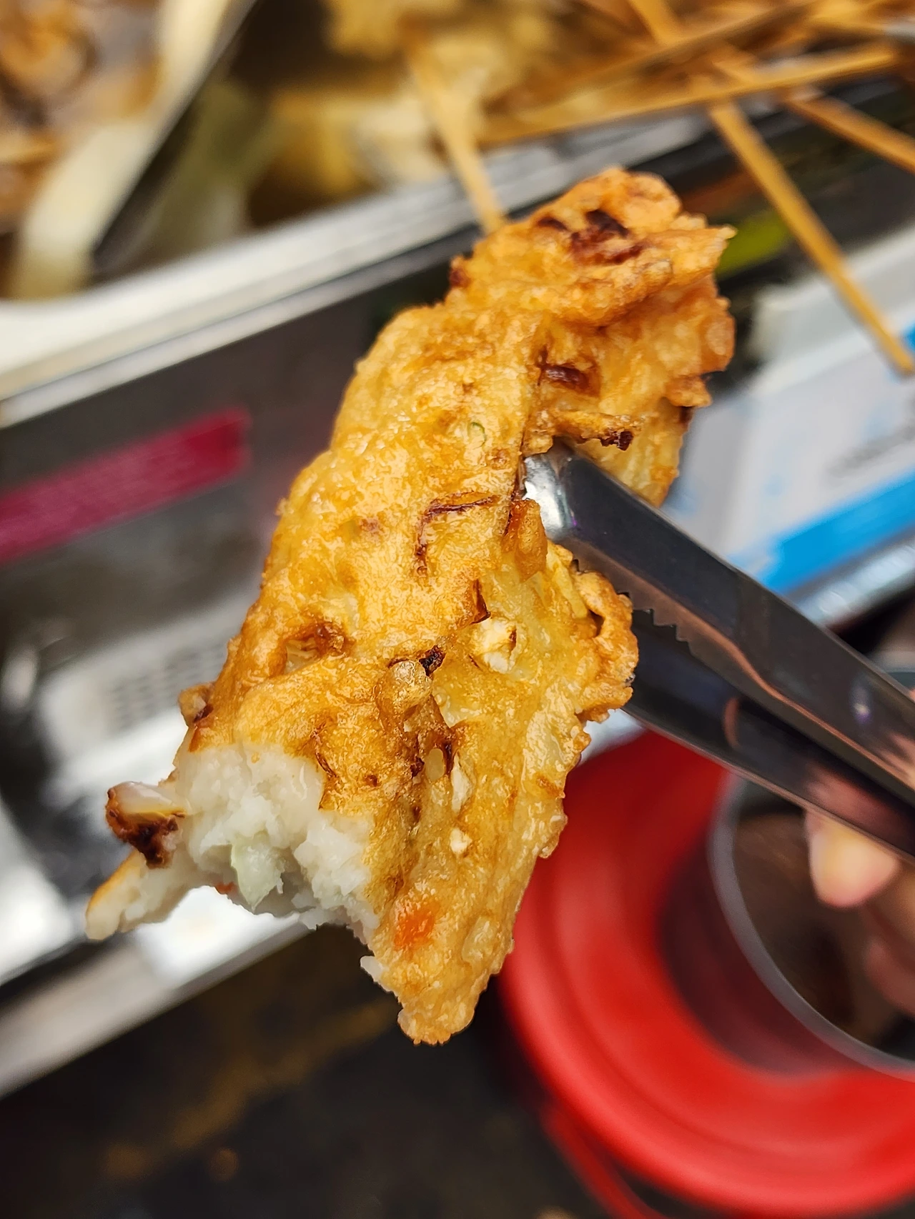 '후불로 돈을 내는 거라, 한두 개씩 집어서 먹다 보면 배부를 때까지 계속 서서 멈추지 않고 주워 먹겠는데. 갓 튀겨 나온 튀김이라 더 맛있네.'