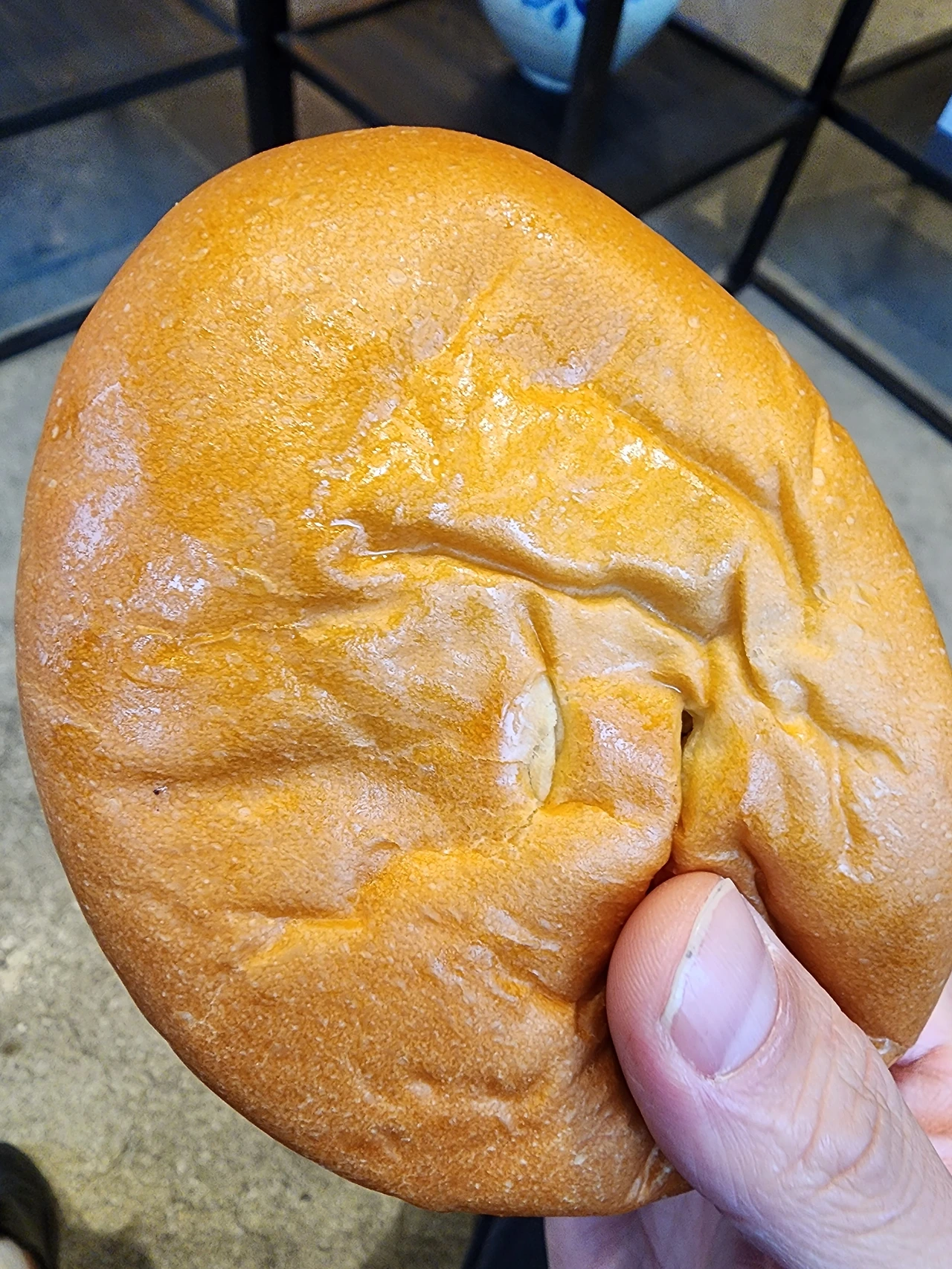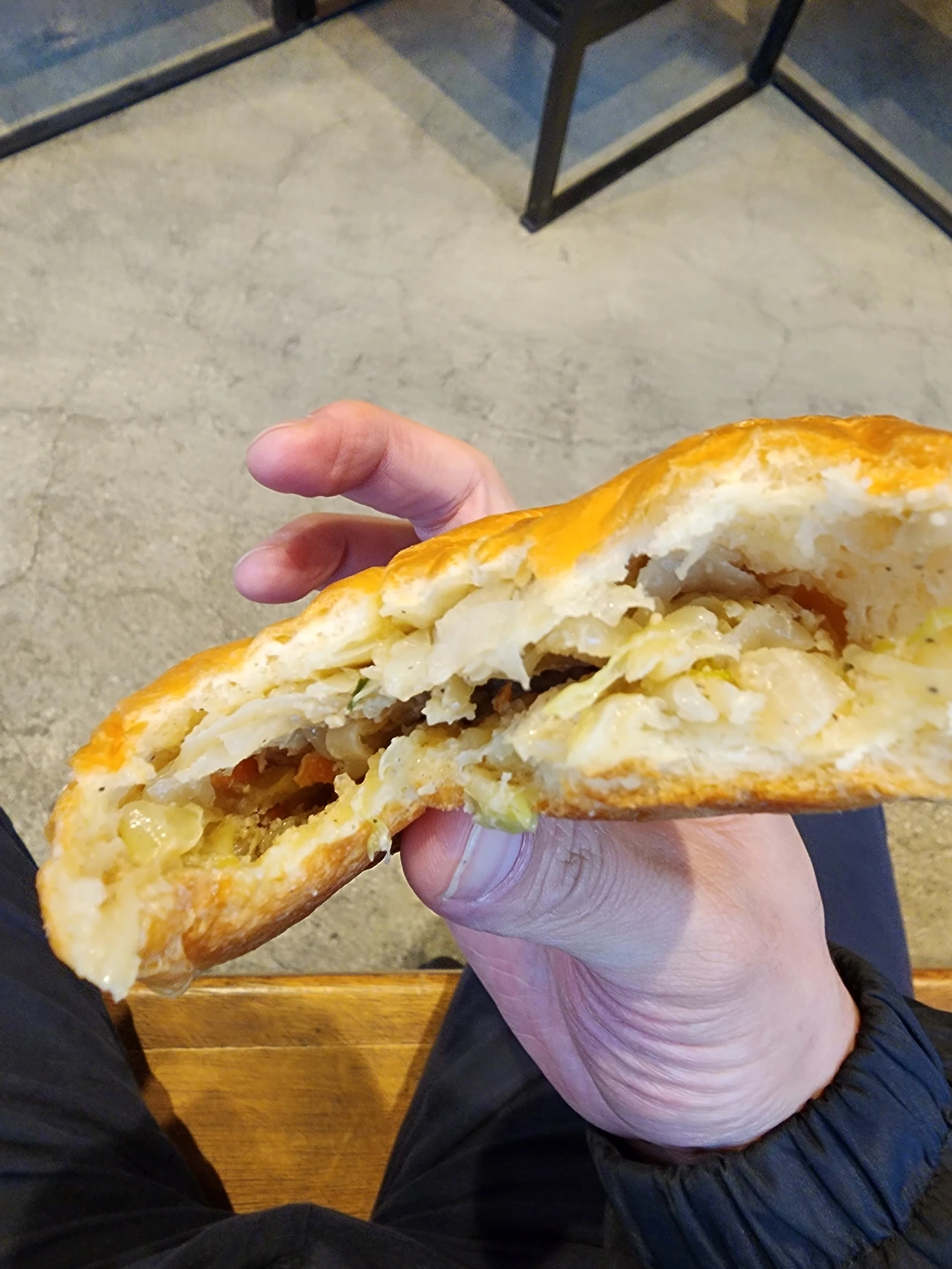 한 입 베어 물어보니 갓 구워져 나온 빵이라 빵 겉면에 발려진 고소한 기름과 버터의 맛이 푹신하고 구수하게 입과 코 안으로 밀려들어온다, 속이 조금 더 채워져 있는 안 쪽을 물어뜯어 공략한다.