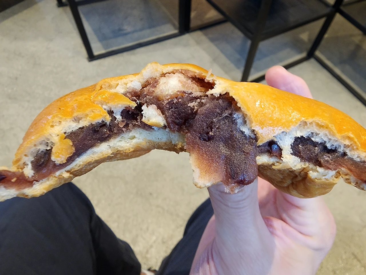 단팥빵을 베어 물었더니 처음부터 강렬하고 달콤하며 입안을 정복하는 단팥의 맛이 그대로 직격타를 날린다. 일반적으로 단팥빵을 먹으면 단팥소가 적당히 있고 단팥을 담아내는 역할을 하는 빵이 두께가 조금 있는 편이라서 단팥의 단맛이 강하지 않은 경우가 많은데 입안을 가득 채우는 달콤한 단팥소가 한 입만 먹어도 단팥소를 퍼먹은 기분이다. 혹시나 몰라서 단팥소를 덮고 있는 단팥빵의 피 두께를 보니 생각보다 많이 얇다, 역시나.