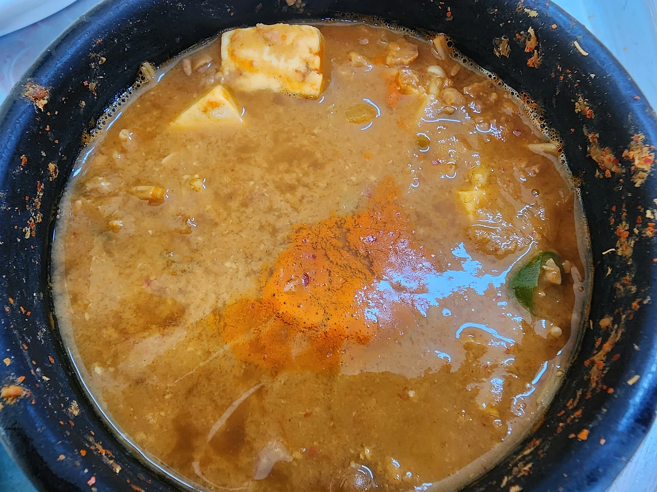 작은 뚝배기에서 용암처럼 부글거리는 뚝배기를 한입에 먹기에는 아직 조금 무섭다, 흥분되는 마음을 가라앉히고 잠시 후후 불어 식힌 후에 흡입한다.