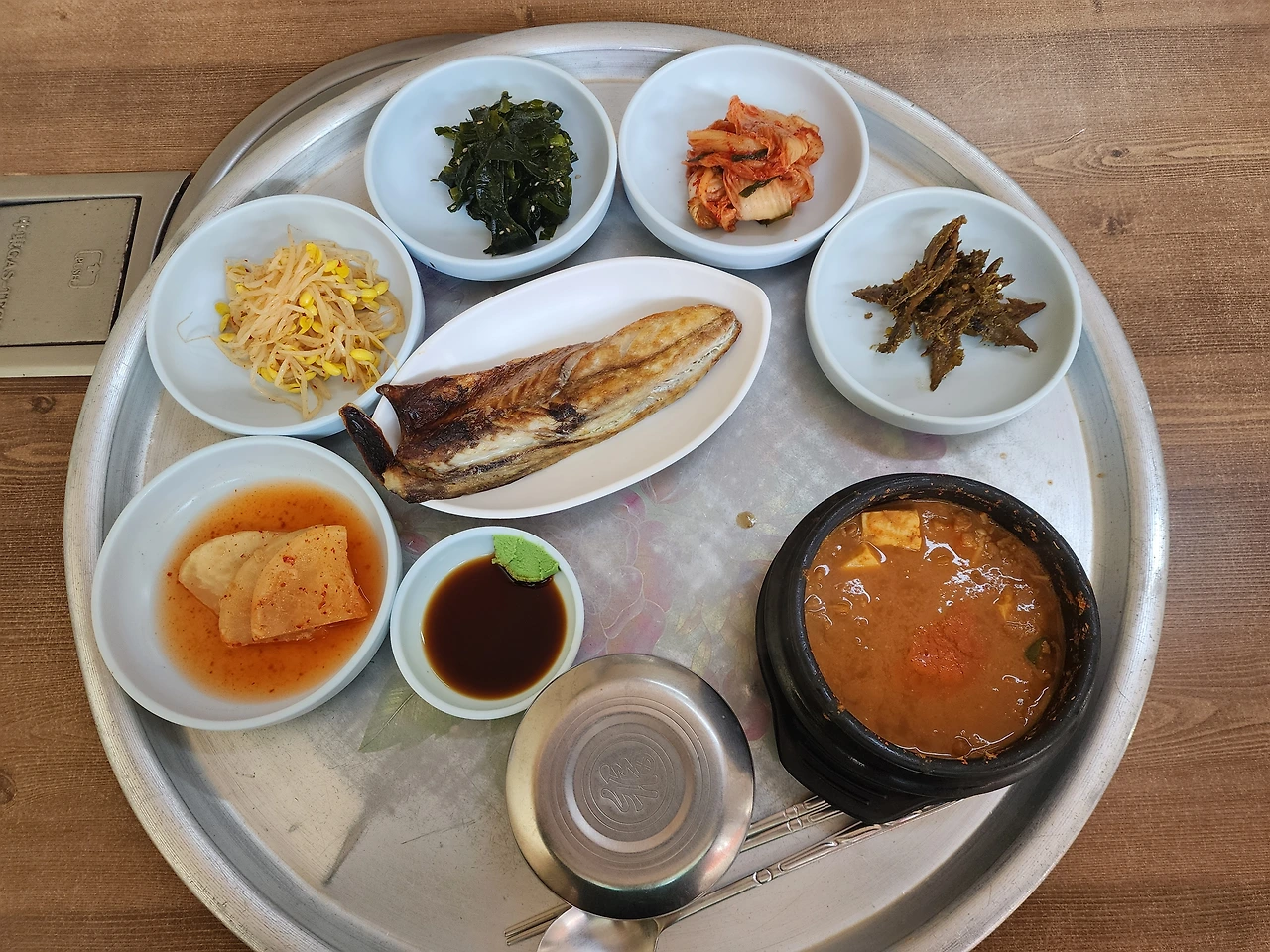 잠시 주방에서 무언가를 끓이고 지지는 소리가 나더니 살짝 탁한 은색 스테인리스 둥근 쟁반 위에 밥, 청국장, 고등어구이에 반찬들이 함께 올려져 나온다. 여느 한식집에서 볼 수 있는 정겹고 익숙한 구성, 반갑다.