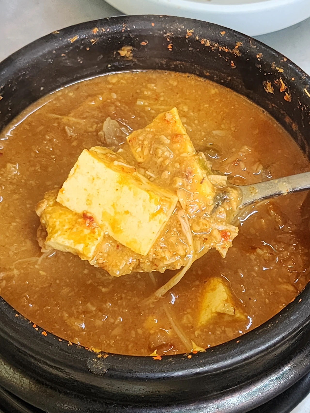 한입 크기로 썰려 하얀 젤리처럼 보이는 정사각형의 두부와 청국장의 밀도 높은 부분을 듬뿍 숟가락으로 떠서 잠시 식히고 입안에 밀어 넣는다.