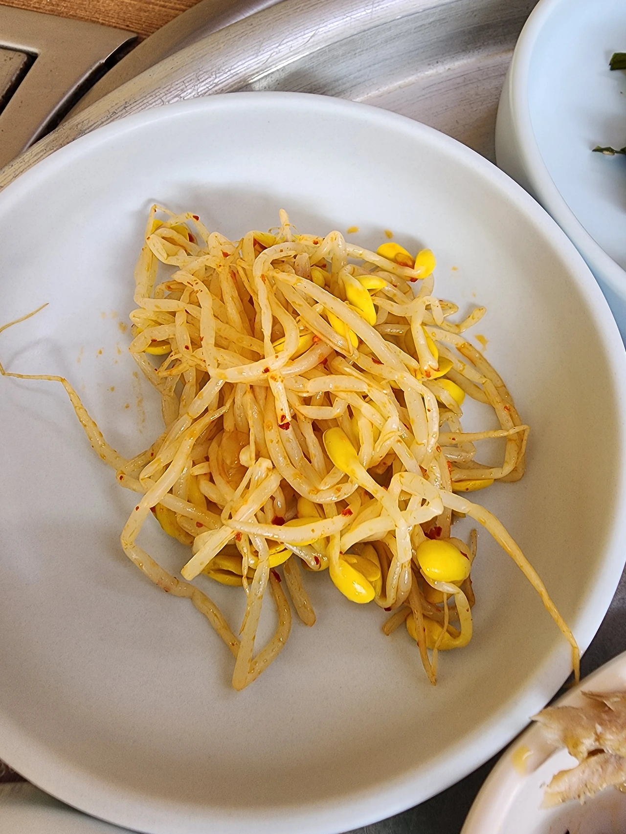 청국장과 고등어구이라는 주메뉴의 확인이 끝났으니 다른 밥반찬들도 확인에 들어간다. 붉고 투명하게 버무려진 콩나물무침은 시원한 콩나물의 맛과 아삭함에 들깻가루의 고소한 여운이 입안에 남고, 배추김치에서도 상쾌하고 시원한 감칠맛이 식사 시간의 즐거움을 더한다.