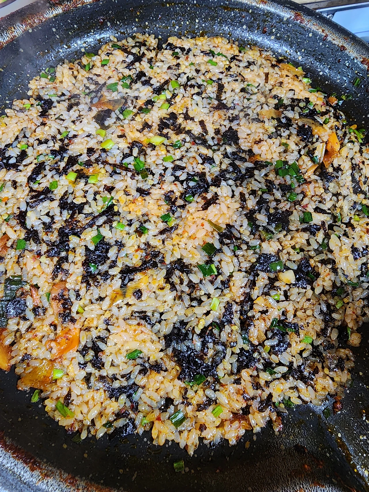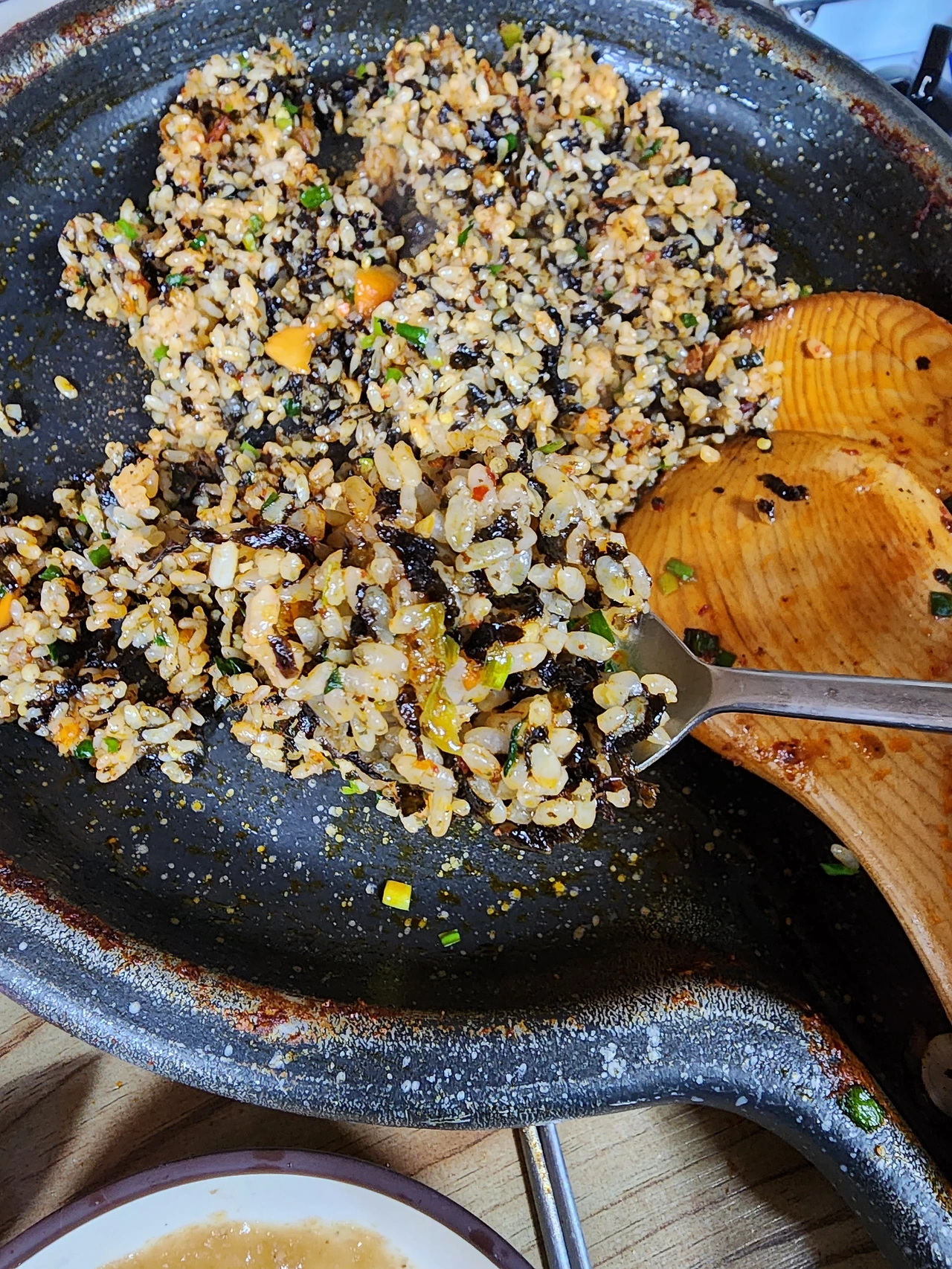 "어라, 양념도 안 남기고 야무지게 긁어드셨네요. 볶음밥 갖다 드릴게요~"하고는 철판을 통째로 가져가신다. 김고로는 양념이 안 남아서 아쉽다기보다는 철판을 통째로 다 가져가기 전에 모든 음식을 깨끗이 잘 먹었다는 마음에 다행이고 뿌듯하다. 양념을 밥에 같이 볶기보다는 그 자체로 먹고 싶은 맛이었으니까. 주방으로 들어간 철판은 잠시 지지고 볶는 소리가 주방에서 나더니 하얀 쌀밥과 검고 짭짤한 맛김조각들이 날치알들과 어울려 또 다른 맛을 선사할 것이라고 예고하며 우리 앞으로 다시 등장했다.