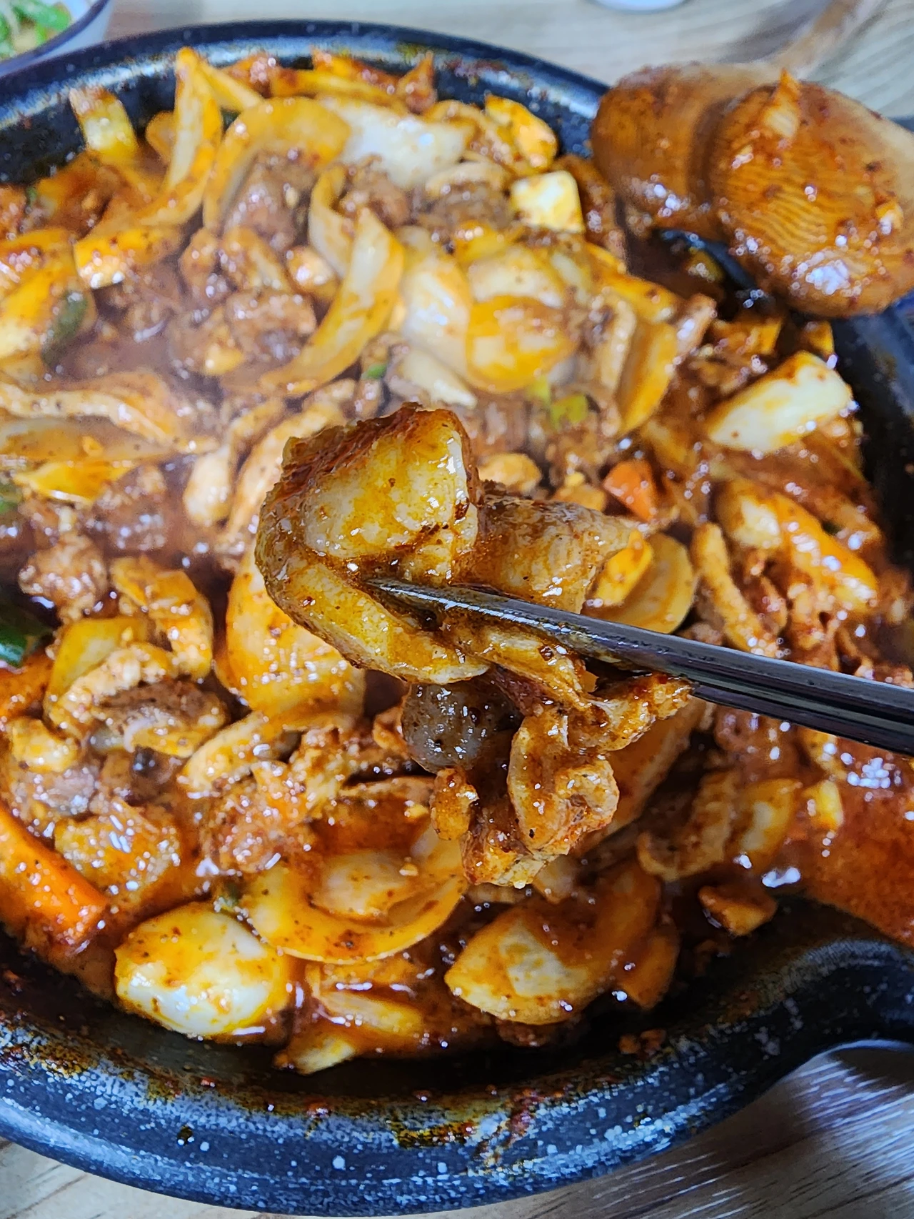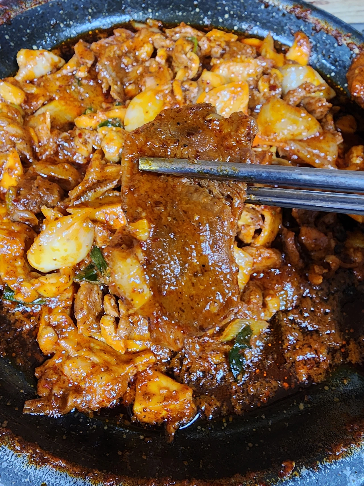 "이 정도의 오리고기는 집 주변에서 사서 먹을 수 있겠는데, 이 양념의 이 집만의 특별한 맛이지. 주물럭의 양념맛이 좋으니 닭볶음탕의 양념도 궁금해지네."