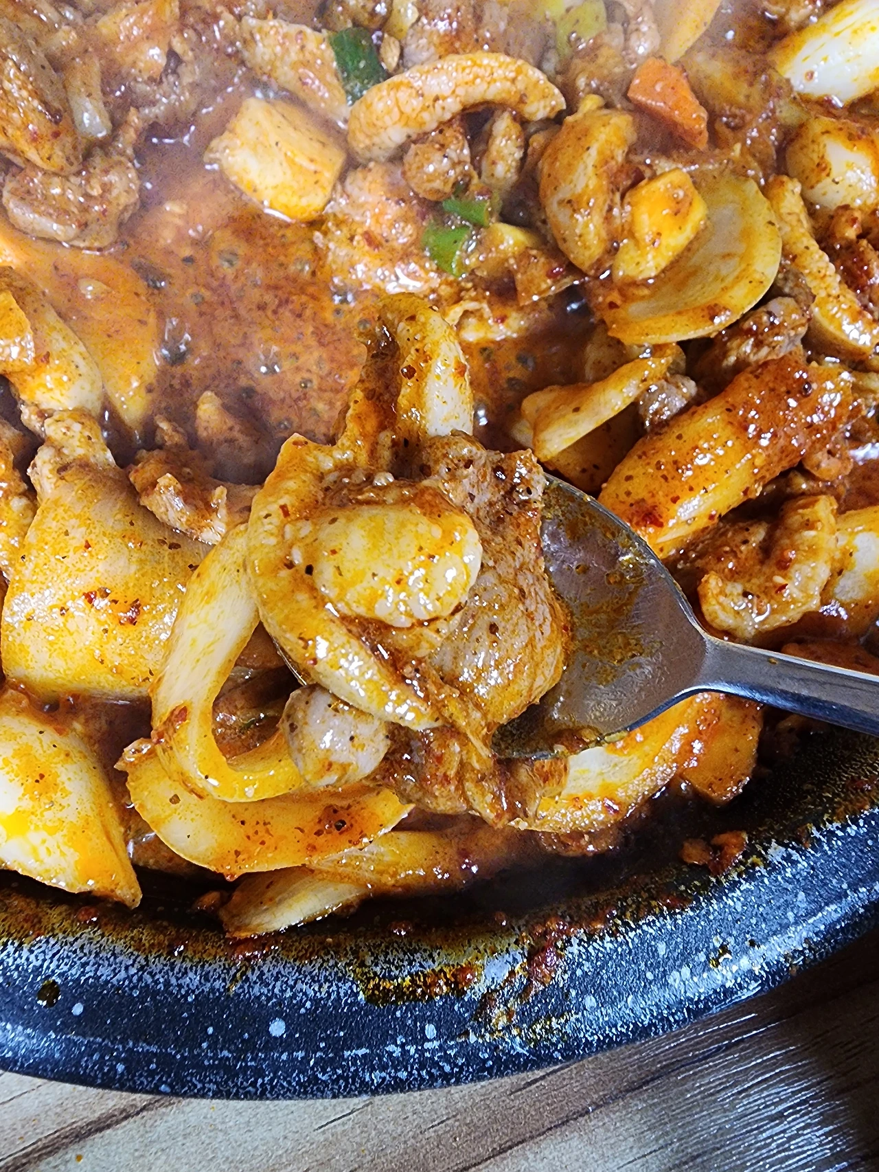 오리고기를 입안에 넣는다. 덜 익었을 때보다는 더 진하고 달착지근하며 입안에 폭포처럼 퍼지는 매콤 달콤한 양념이 압도적인 맛이다. 그 위로 흩뿌려진 들깻가루에서 나오는 고소한 들깨의 풍미가 감칠맛 나고 매콤한 양념의 끝에 견과류의 고소함을 남기면서 마무리한다, 일반적인 닭고기나 돼지고기보다 입안에서 더 튕기는 듯한 식감이 느껴지는 쫄깃한 오리고기의 식감이라 씹으면 씹을수록 양념도 함께 터져 나와서 더 맛이 좋다. 나는 숟가락으로 양념과 함께 채소, 버섯을 퍼먹는다.
