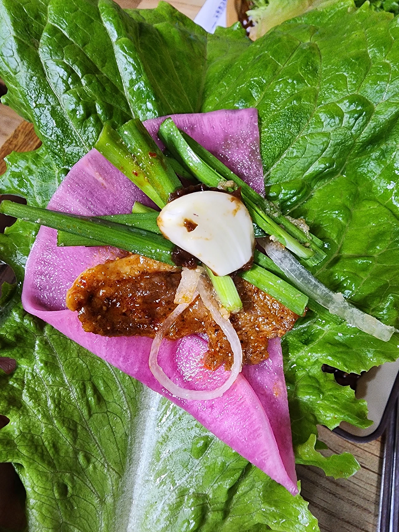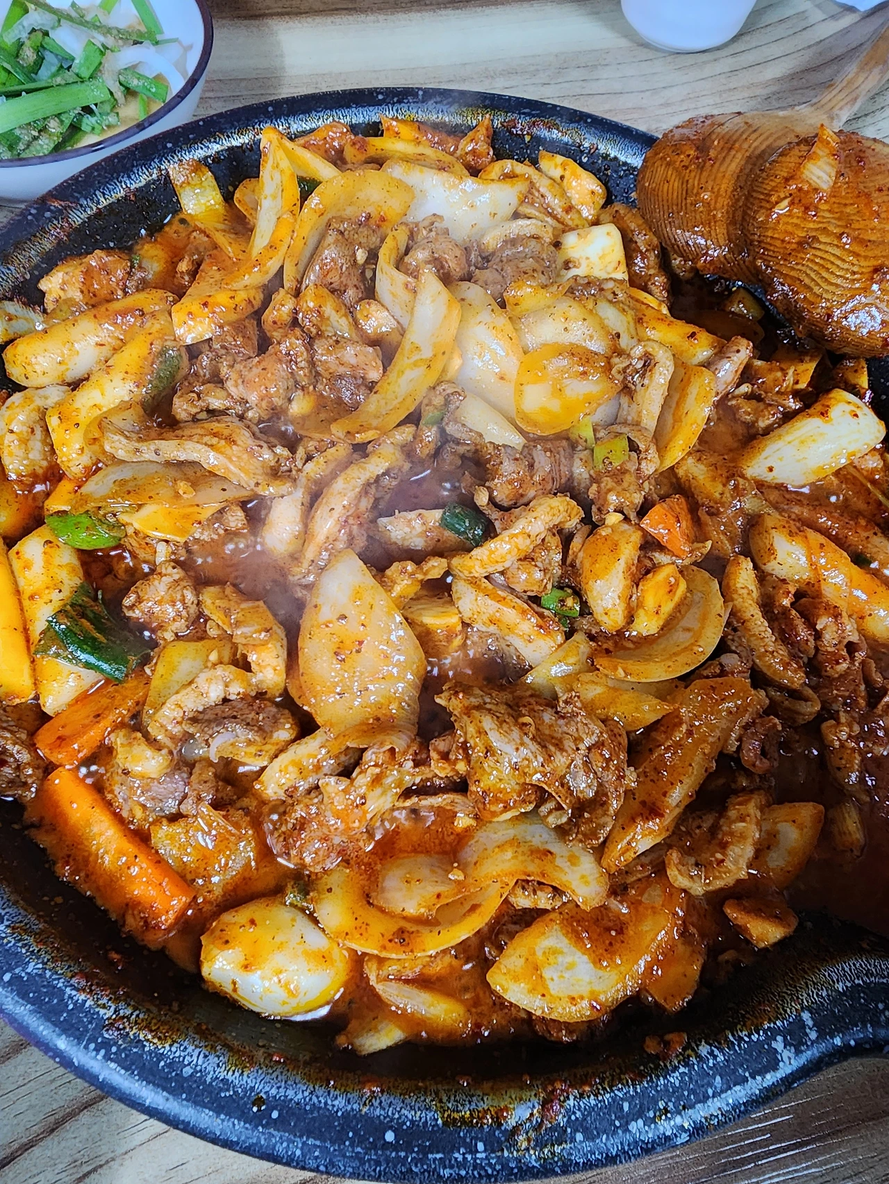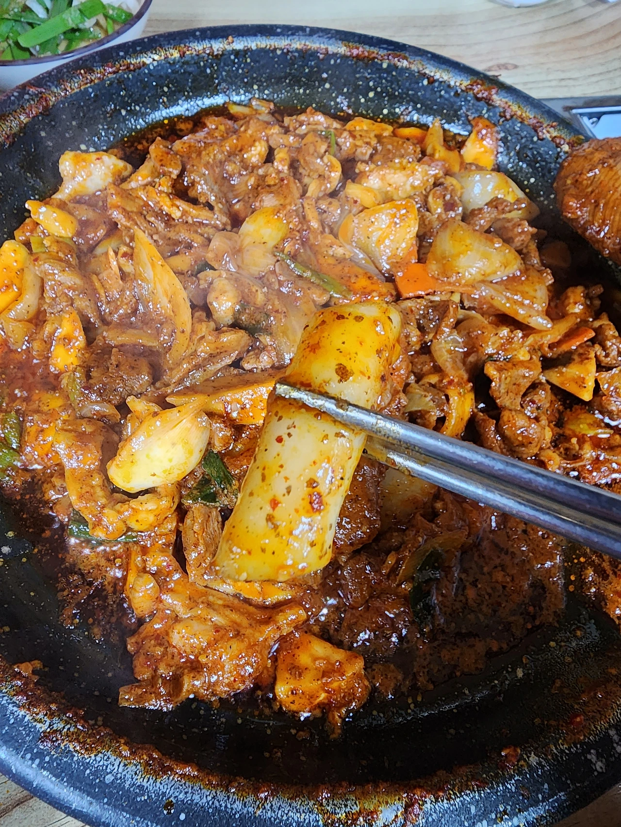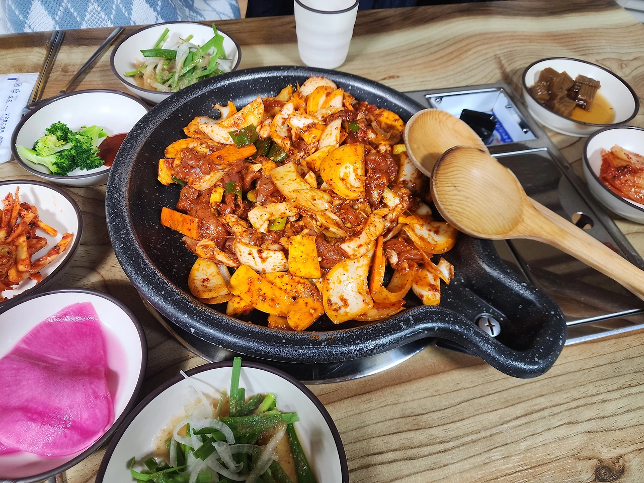 우리가 싫어하는 식재료인 오이가 들어있는 반찬을 제외하고는 대부분의 반찬도 손맛이 좋았고 김치맛도 시원하다. 그리고 두꺼운 철판구이팬에 신선한 채소와 붉은 양념이 묻은 오리고기를 올린 주물럭이 등장한다. 가스버너 위에 올린 음식을 번쩍 들어 가져오신 홀직원분은 옻칠이 된 나무 주걱으로 슬슬 고기들을 뒤집고 볶으면서 얘기하신다.