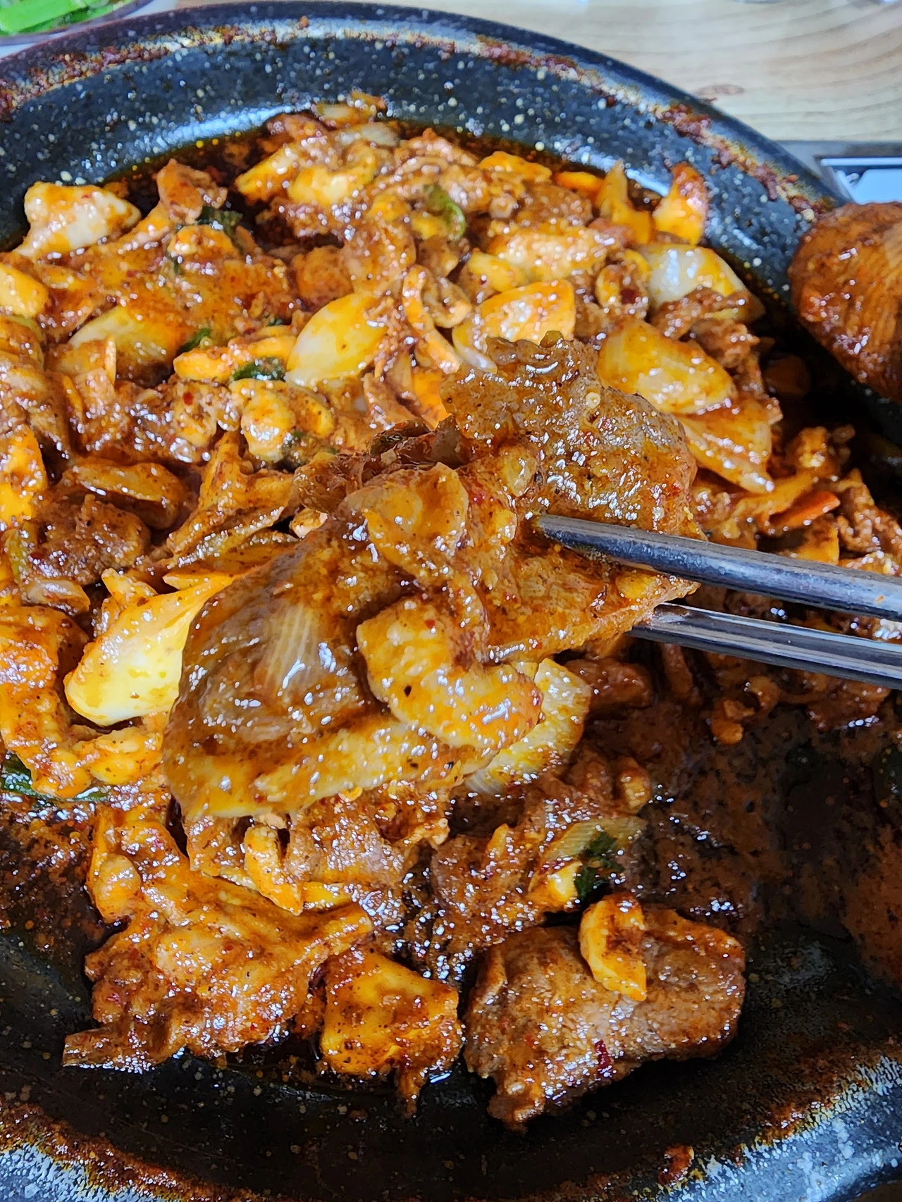 시장했던 우리는 도토리묵, 도라지무침, 김치 등 반찬들을 주섬주섬 집어서 먹다가 오리주물럭에서 피어오르기 시작하는 수증기에 섞인 고추장의 달달하고 매콤한 냄새에 군침이 싹 입안에서 도는 것을 멈출 수가 없었다. 특히 나는, 고기가 얼른 먹어보고 싶었다. 양파와 채소들이 투명해지고 버섯도 익은 것처럼 보이니 나는 고기가 다 익었는지 시식을 해보기로 했다, 제발 빨리 먹고 싶으니까.