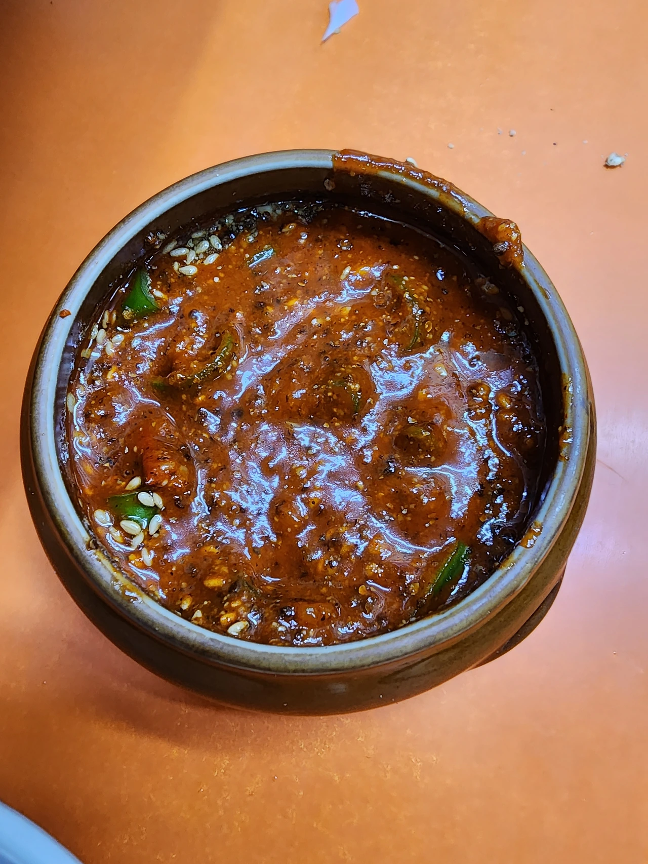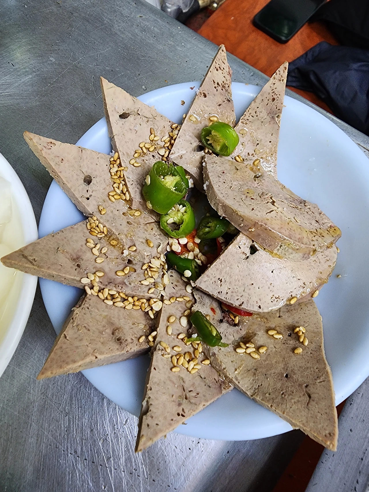 그가 그 목표한 것을 위해서 다시 걸어가고 있다고 하니 마음이 기쁘다, 그건 그렇고, 백순대 철판볶음에 곁들임 반찬으로 나오는 삶은 간을 들어서 일단 그대로 먹어본다. 얇지만 새하얗게 삶아진 간의 밝은 맛은 담백하면서 고소하다. 돼지부속의 냄새도 없고 일반적인 분식집에서 썰어주는 삶은 간보다는 더 가볍고 고소한 맛이 좋다. 함께 올려진 청양고추를 얹어서 들깨와 막장, 고추가 섞인 양념장에 콕 찍어서 다시 한번 씹어본다.
