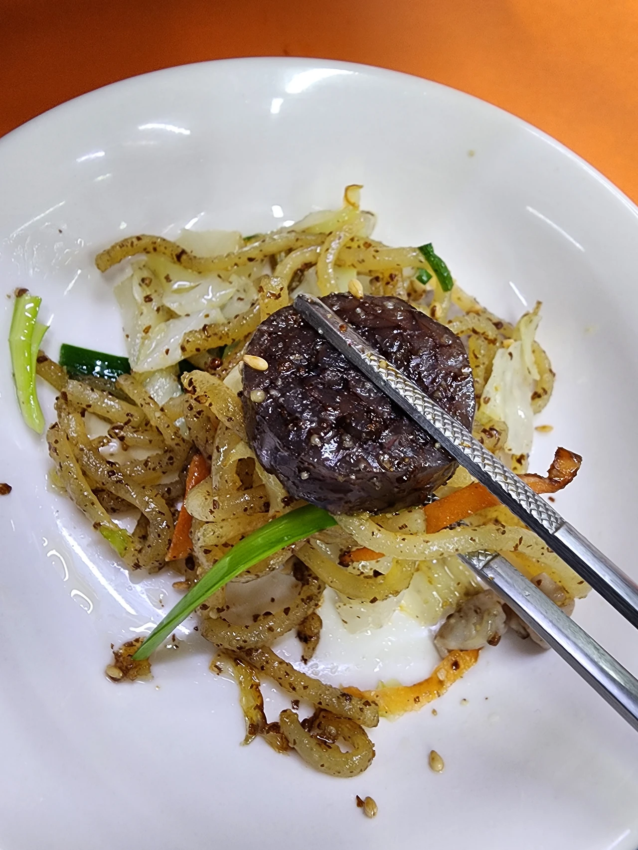 일반적인 찹쌀순대, 어두운 핏빛이 나는 모습이지만 철판 위에서 들깨와 함께 볶아졌기 때문에 더 고소한 향이 스멀스멀, 모락모락 열기와 함께 나의 후각세포들을 깨운다.