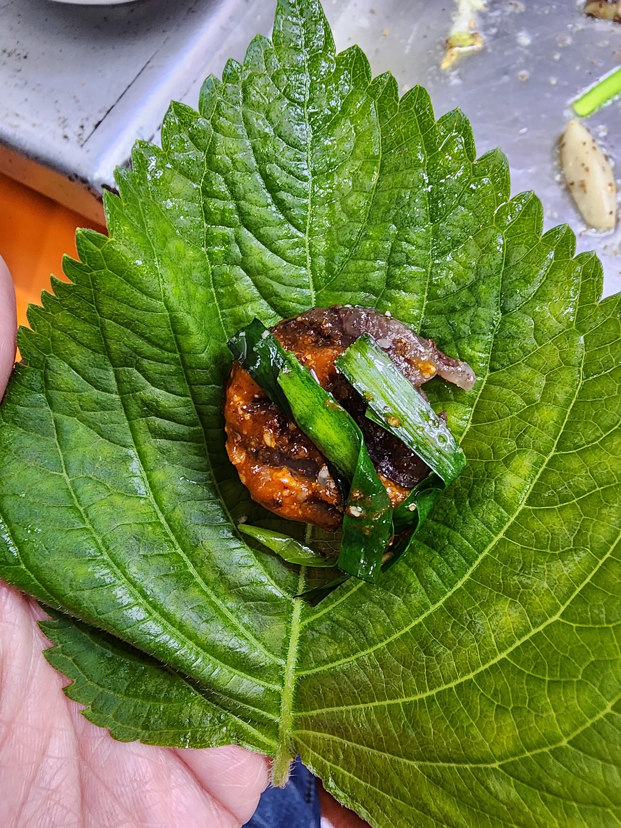 이렇게 철판에 직접적인 젓가락질만 하면 금방 먹어버릴 것 같아서 먹는 속도를 조절하기 위해 일부러 깻잎에 순대를 올리고 양념쌈장을 곁들여서 싸 먹는다. 돼지고기와 잘 어울리는 깻잎과 들깨라서 그런지 들깨와 깻잎의 향이 코로 확 올라오다가 양념쌈장의 감칠맛과 약간의 매콤함으로 계속 먹었던 돼지의 맛과 견과류의 향에 찬물을 끼얹으며 지루함을 씻어낸다. 고기를 쌈 싸 먹는 것과는 다른 쫄깃하고 끈질긴 식감, 간이 강한 쌈장의 잔여미 이후에 다시 시원한 맥주 한잔을 마시면서 다시 백순대와 채소들을 집어서 고소함과 심심한 맛으로 입을 기름칠하고, 또 맥주를 한잔. 뜨거운 철판만큼이나 달궈져 버린 김고로의 입맛과 군침은 마를 기미가 보이지 않는다. 덕분에 Y형과 김고로가 맥주를 한잔씩 걸치면서 쫄면과 채소가 아직 붙어있는 철판을 긁을 때까지, 시간은 얼마 걸리지 않았다.