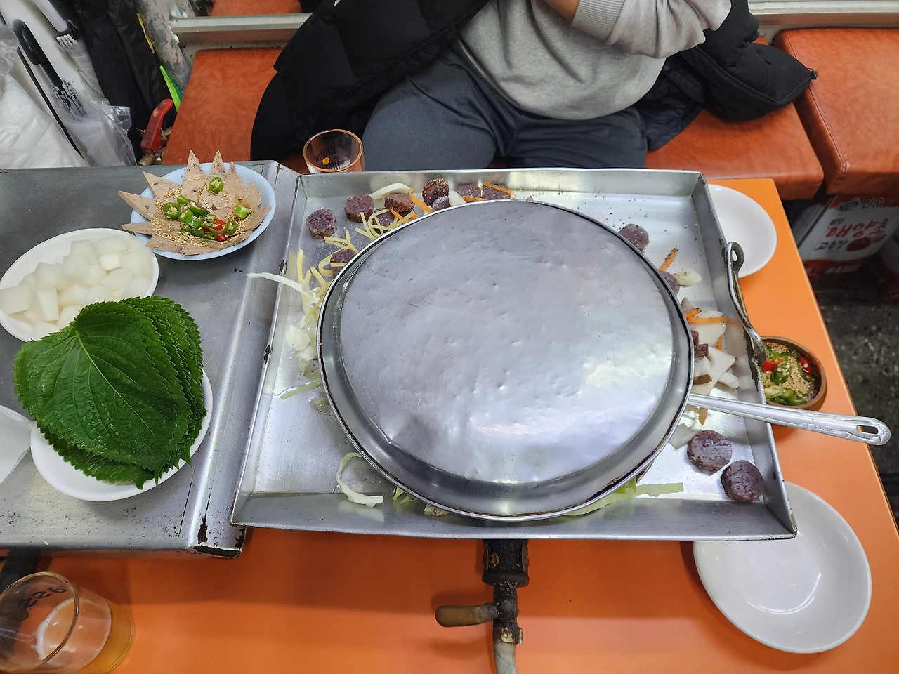백순대철판볶음이 다 완성되기까지 우리는 서로의 이야기를 하며 삶은 간을 거의 다 먹어갔고, 간이 다 사라질뻔한 무렵에, 백순대볶음에 들어있는 양배추와 쫄면사리가 반투명해지며 다 익었음을 신호하자 우리의 철판을 돌봐주시던 직원분의