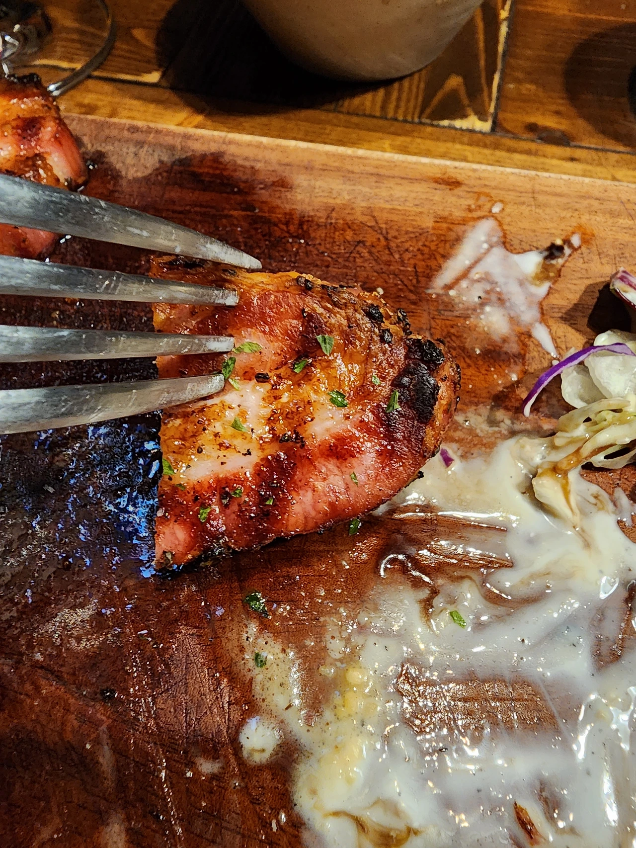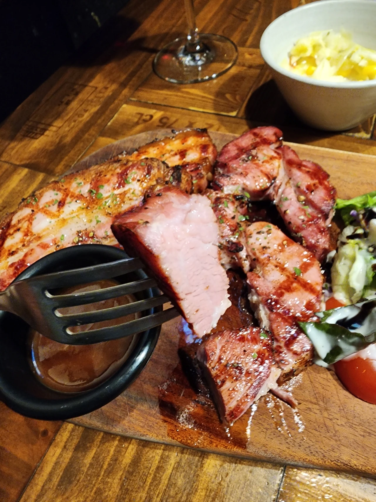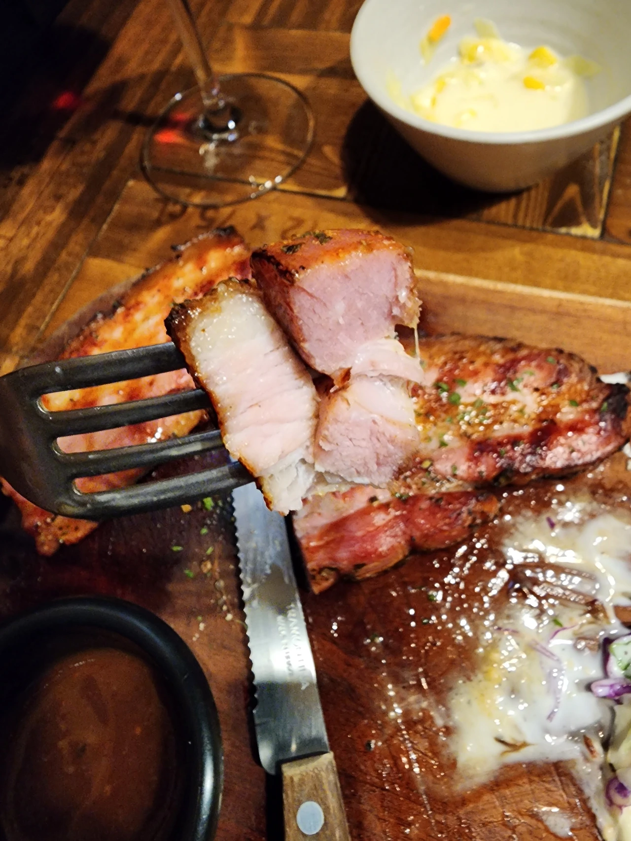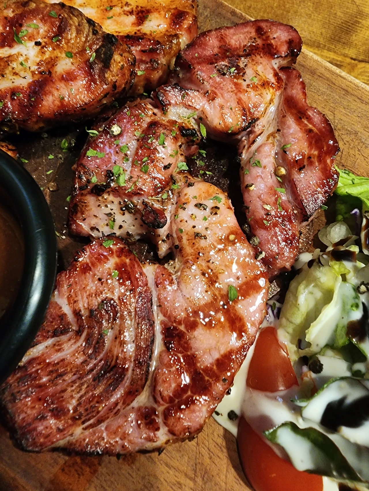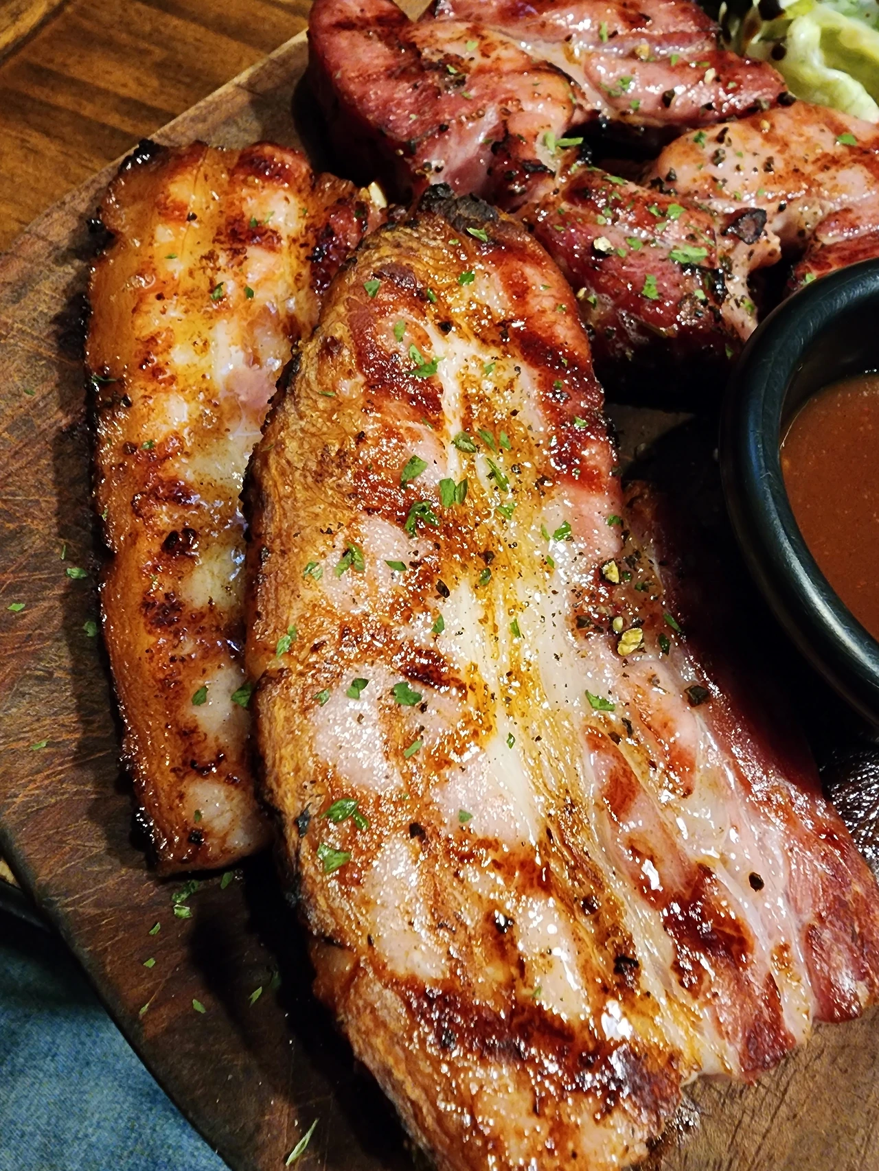 '목살이지만 훈제로 익히고 다시 그릴에서 구워낸 것이라 질기지 않아. 씹을수록 치아 사이에서 고소한 육즙과 연기가 터져 나오네, 이거 목살부터 이렇게 맛있으면 삼겹살은 얼마나 더 맛있을까.'