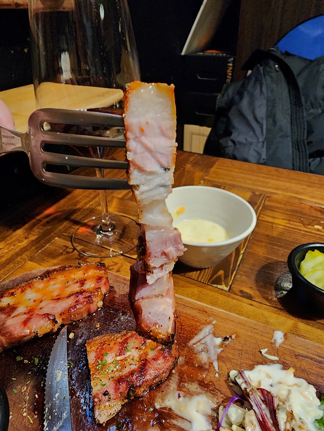 입안에서 터지는 육즙과 비계와 훈연향과 짭짤한 염분의 쿼텟 환상곡 연주에 쌉쌀함과 촉촉함으로 적와인이 마무리를 더하자 눈을 감은 김고로의 행복한 고개 끄덕거림은 멈출 줄을 모른다.