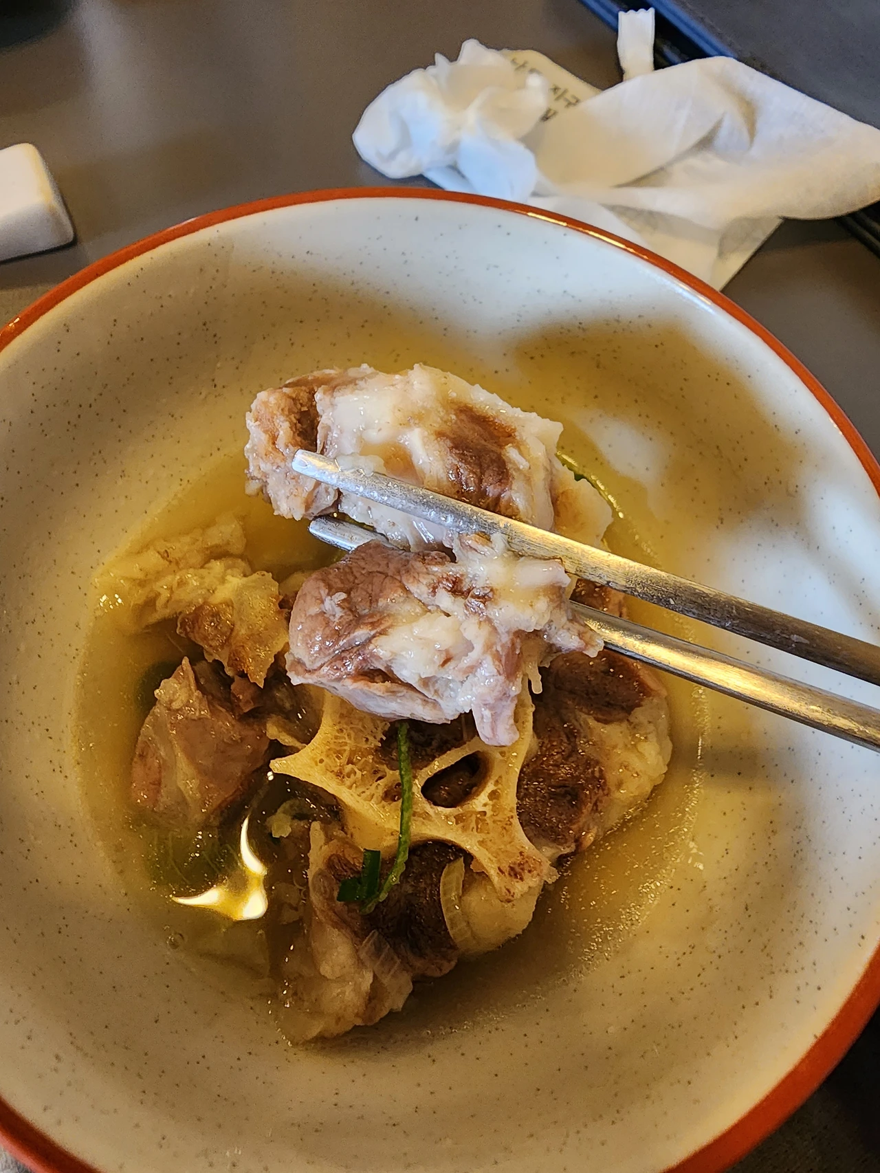 일단 반짝거리는 놋수저를 들어서 꼬리곰탕 국물을 두어 번 떠서 먹어본다.