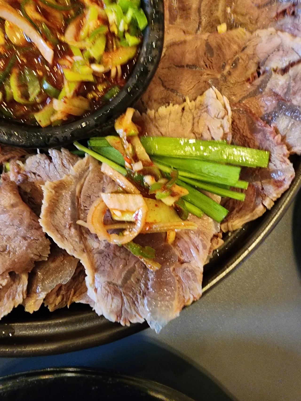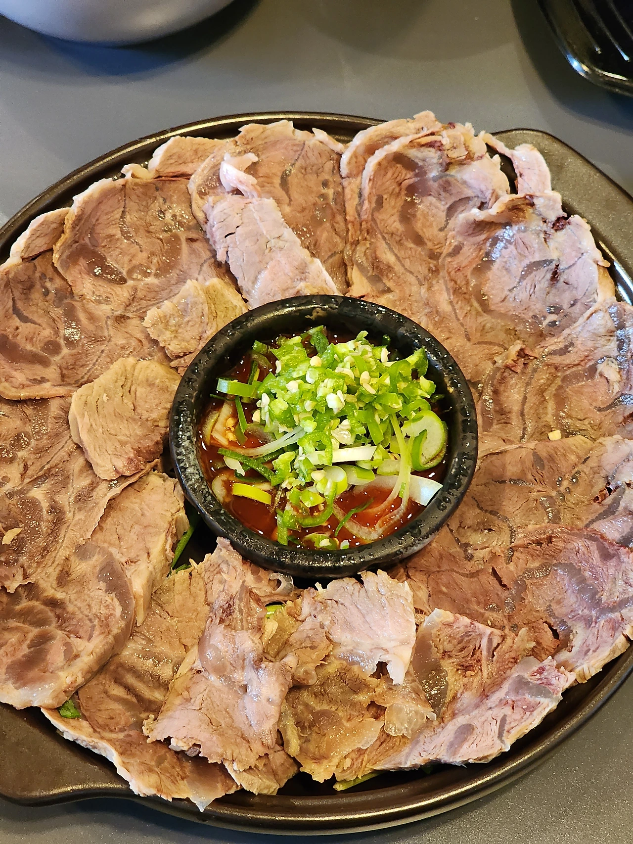 "아롱사태수육 나왔습니다. 부추를 올리고 여기 간장을 살짝 찍어서 드시면 더 맛있습니다."