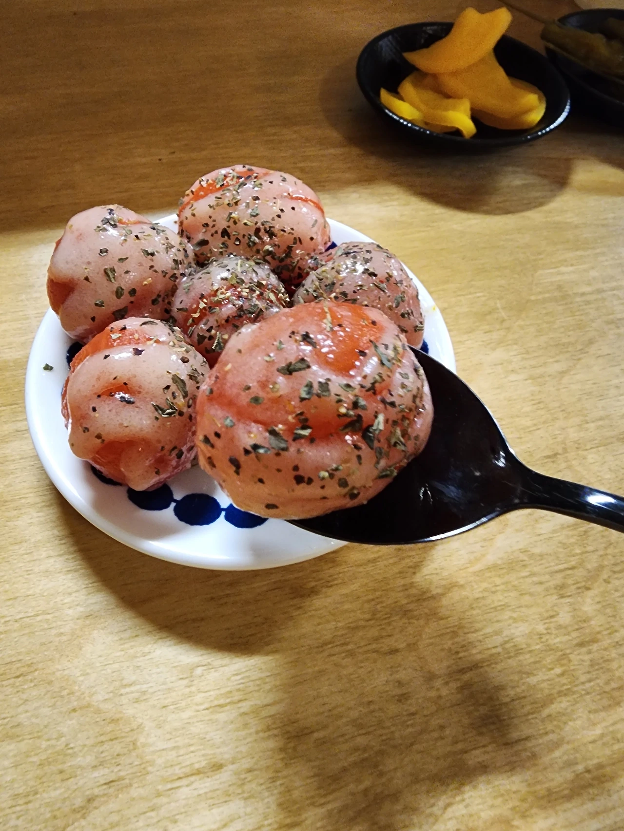 토마토 절임의 새콤달콤한 맛이 입안에서 토마토의 채수와 감칠맛으로 터지면서 입안에 남아있던 기름맛을 말끔하게 씻어낸다. 튀김을 먹을 입이 다시 되었으니 나는 옆에 남아있던 김튀김과 꽈리고추튀김을 집는다.