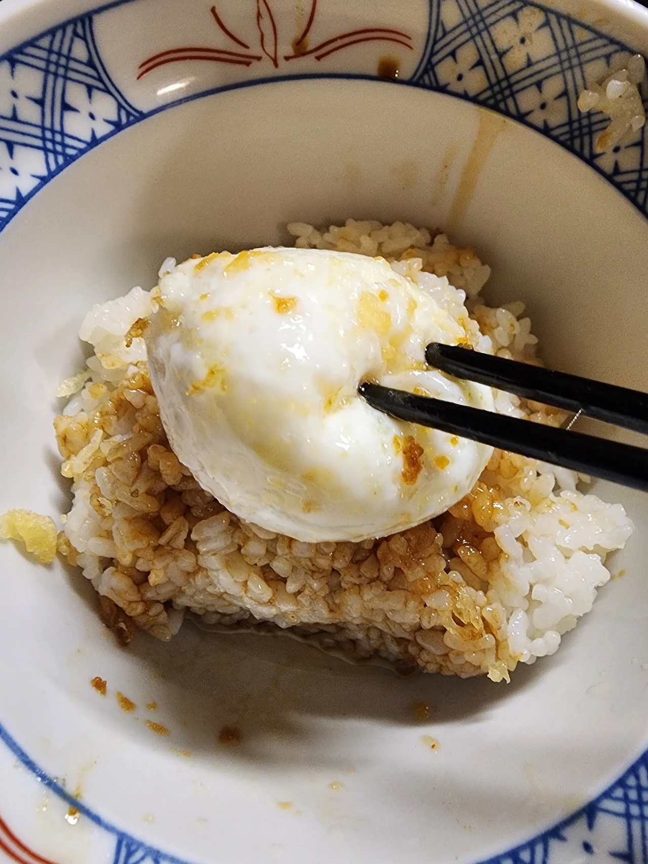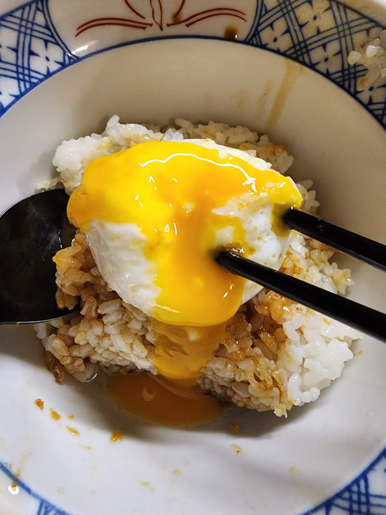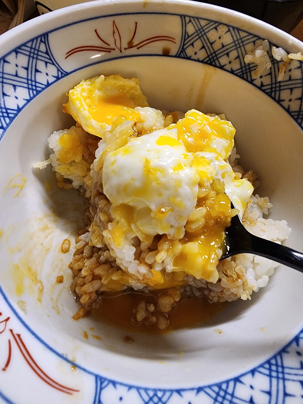 마음 같아서는 김튀김을 조각조각 부서셔 반숙으로 익은 수란튀김을 섞은 밥에 얹어서 먹고 싶지만 김의 맛을 온전히 즐기고 싶은 나는 그런 무자비한 일은 하지 않을 것이다. 꽈리고추의 매콤함과 식감을 즐기고 나서는 마지막으로 남은 달걀튀김(온천달걀)을 밥 위에 올리고 조심스럽게 으깬다. 달걀 안에 숨어있던 노른자가 강처럼 밥 위에 흘러나오고 나는 흰자들을 마저 찢고 부서셔 타래간장으로 범벅이 된 밥과 함께 섞는다. 흡사 간장을 뿌린 달걀밥과 같은 외향이지만 맛은 확연히 다를 것이다. 한 숟갈을 크게 떠서 밥과 달걀을 입으로 옮긴다.