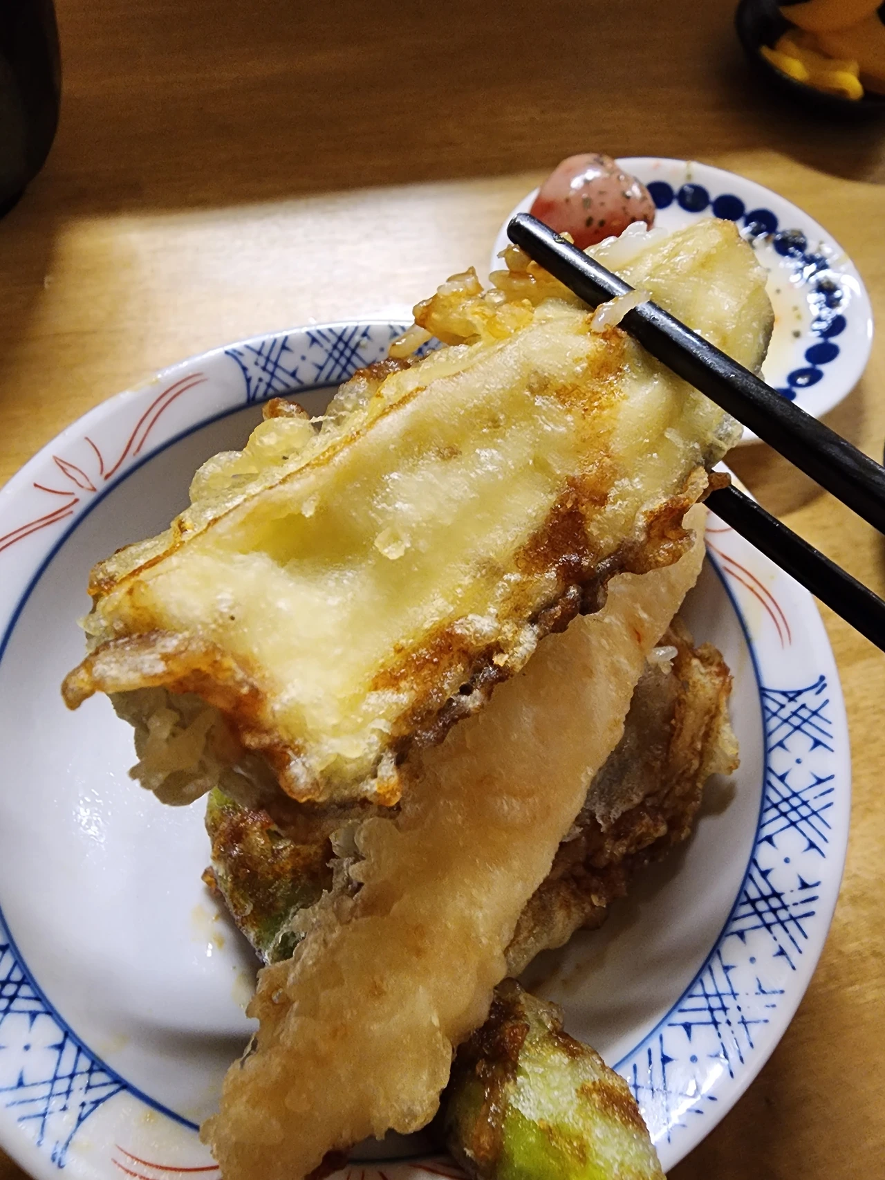 깊게 튀긴 채소 중에 내가 제일 좋아하는 가지를 먼저 집어든다, 가지만두와 풍미가지 등 중국식으로 튀겨진 가지를 즐기는 나로서는 다시 한번 기대가 된다.