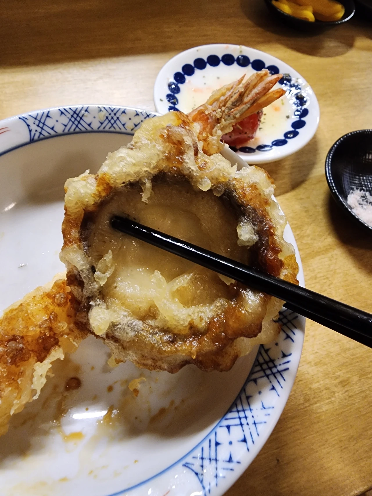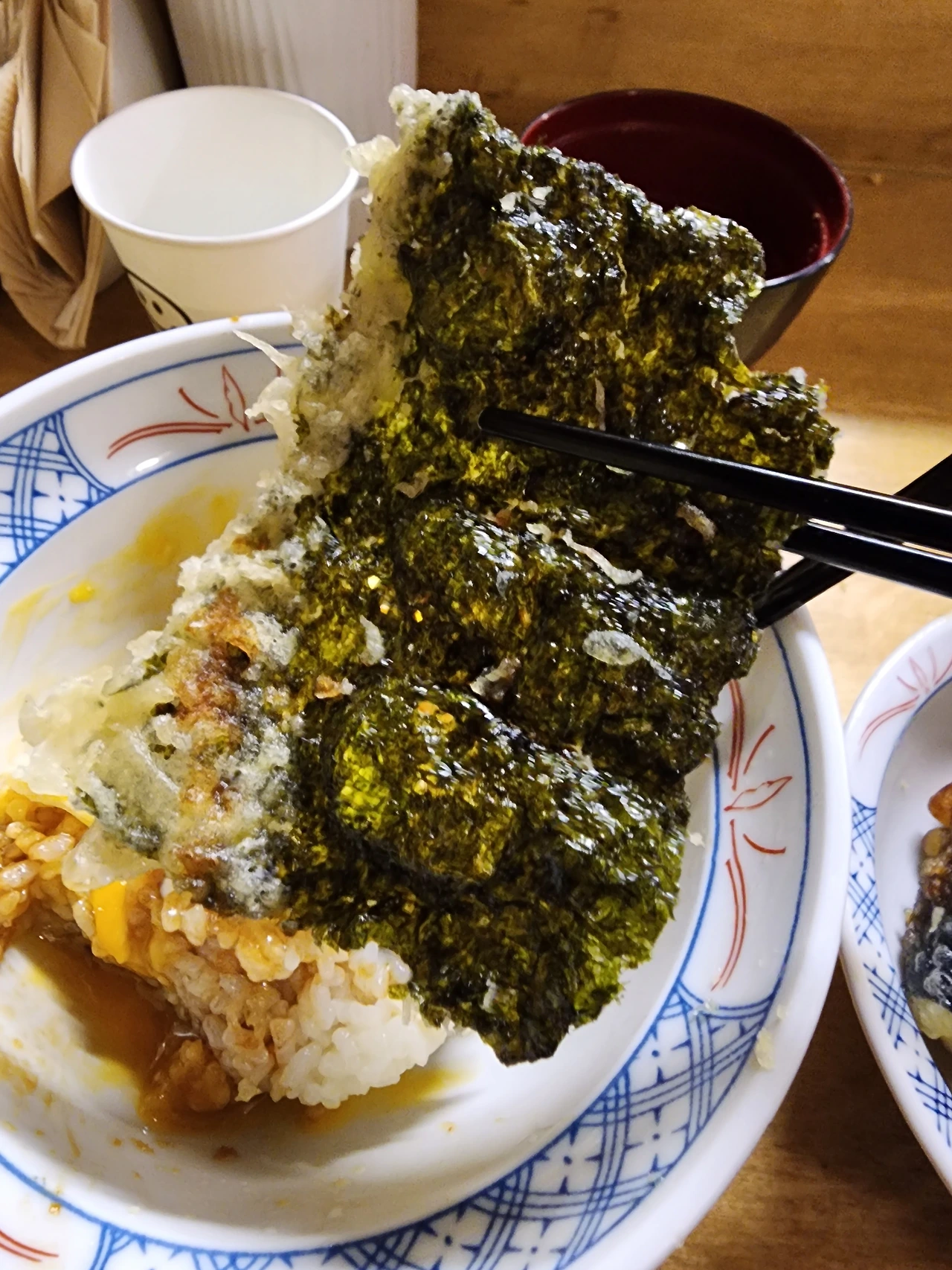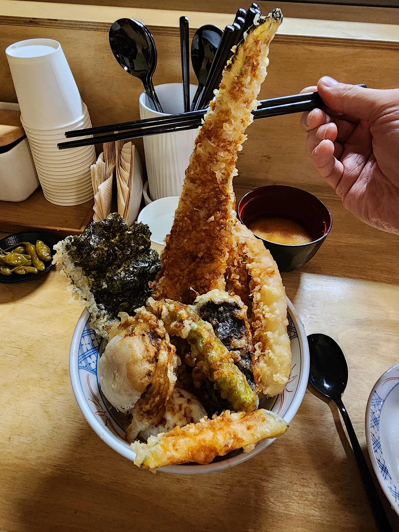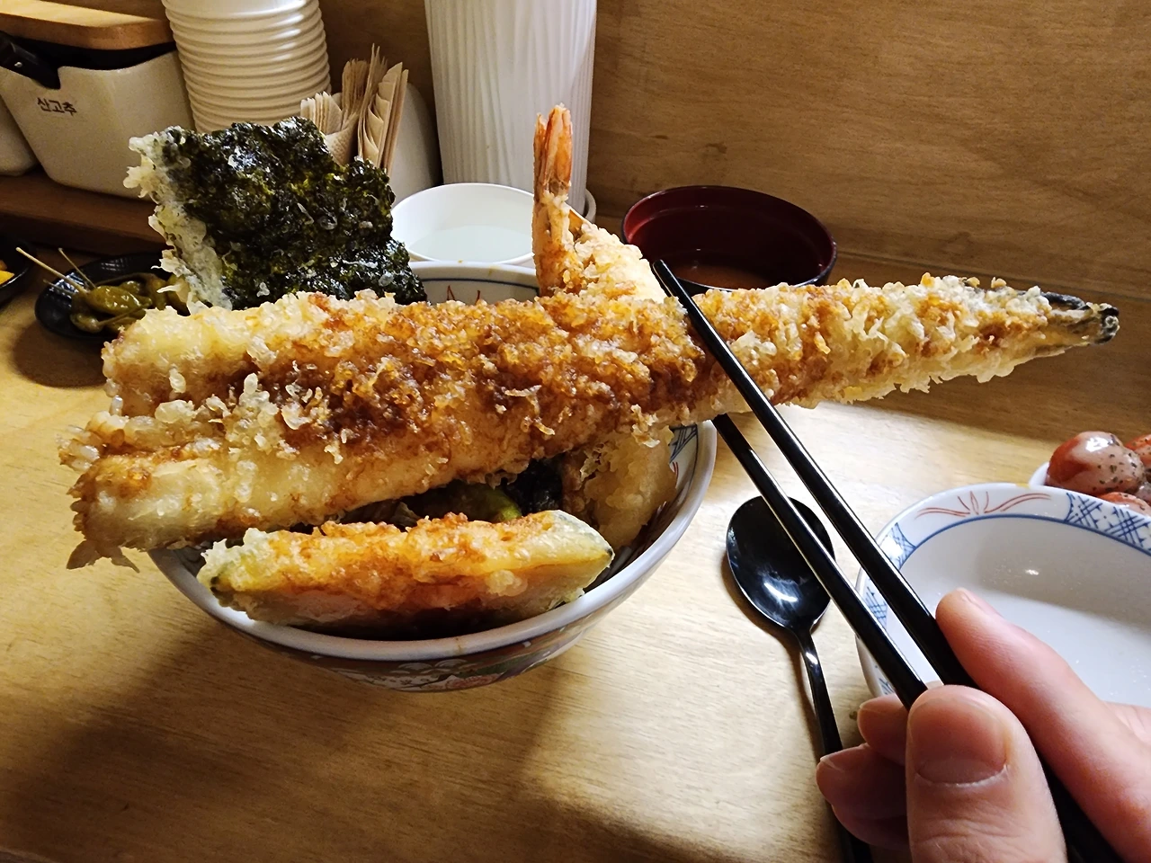 노릇노릇하고 고소한 튀김의 냄새가 이어지는 와중에 뜨끈한 튀김이 올라간 튀김덮밥이 우리에게 도착한다. 김고로의 것은 스페셜이라 덮밥 가운데에 기다란 장어튀김이 우뚝 솟았다. 모두들 약속이라도 한 것처럼 튀김덮밥에 들어있는 튀김을 따로 먹기 위한 앞접시를 잡아서 옆에 내려놓고 각자 먼저 원하는 것을 집는다. 나는 붕장어튀김을 먼저 잡아서 내려놓았다. 일본말로는 '타래'라고 하는 일본식 양념간장이 튀김과 밥 위에 넉넉하게 묻어 있어서 음식의 양념이 부족할 일은 없어 보였다.