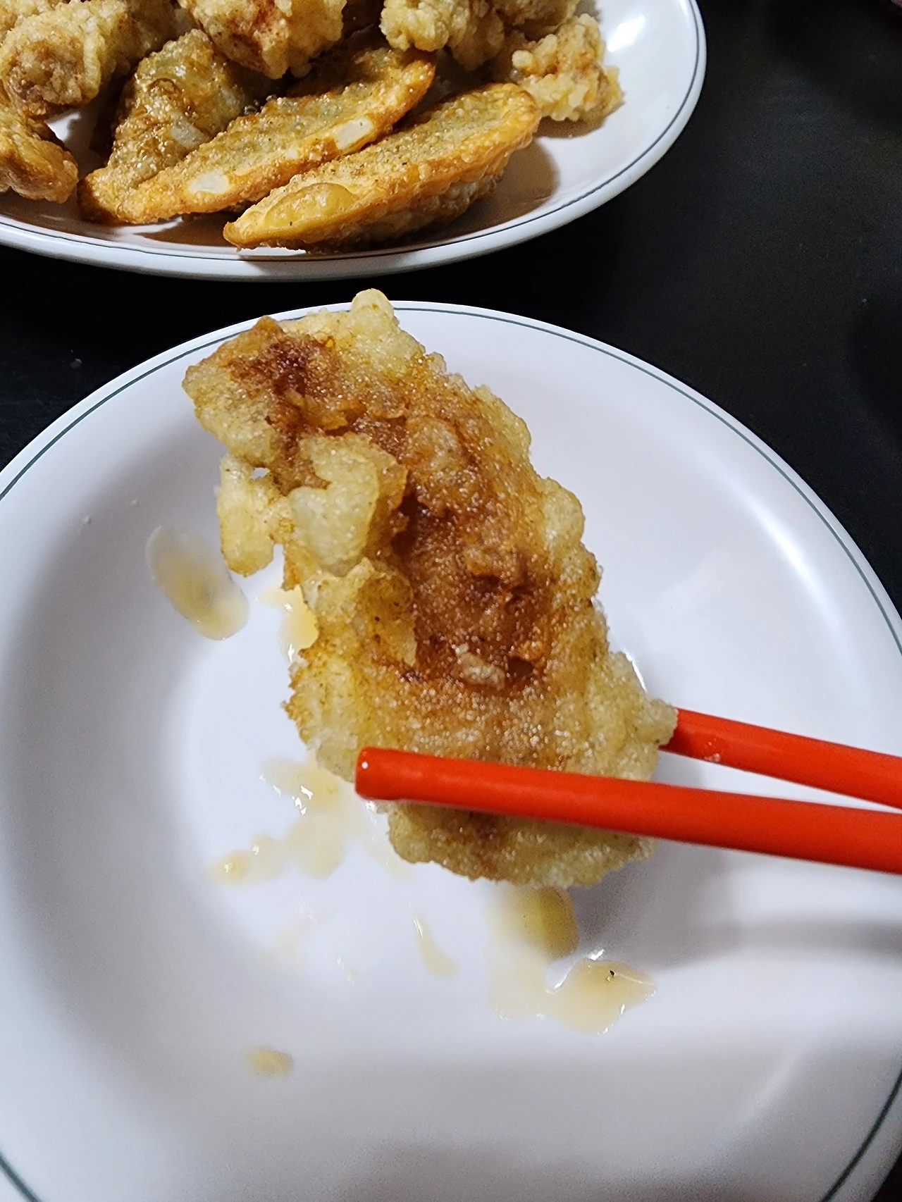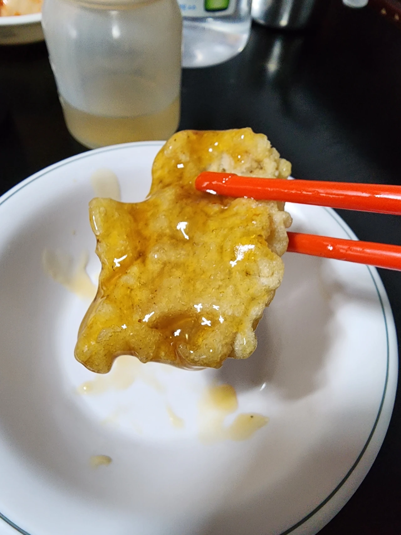 아직 먹지 않고 보기만 해도 노릇노릇, 바삭바삭한 소리가 들리는 듯한 탕수육을 슬쩍, 형님이 젓가락을 드신 후에 바로 들고는 잠시 보다가 반투명한 갈색 탕수육 소스에 찍는다. 설탕과 간장으로 감칠맛과 단맛을 넣어서 맛을 낸 탕수육 소스겠지, 푹 찍어서 입으로 가져간다.