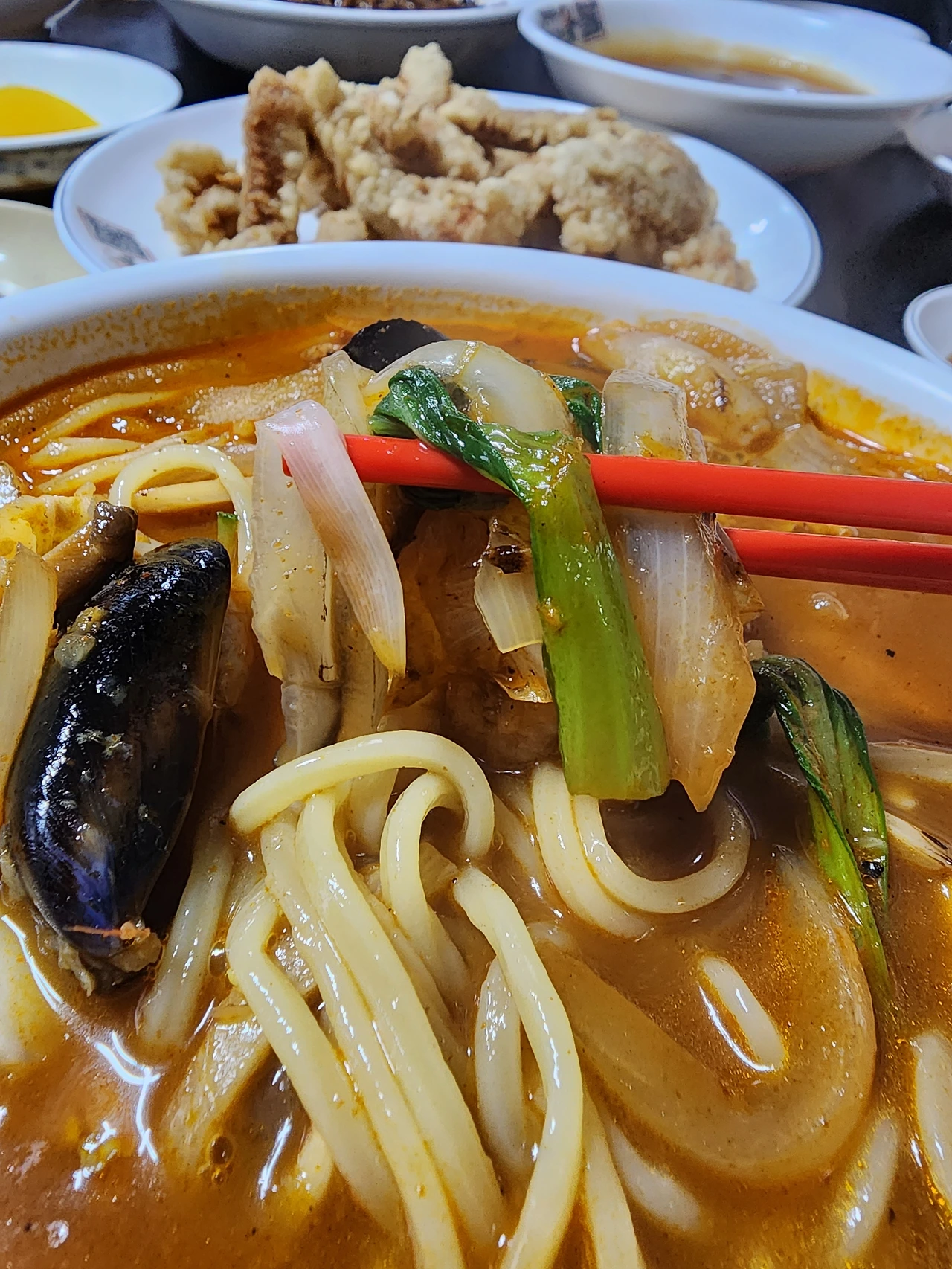 청경채와 오징어를 면과 함께 들어서 국물을 충분히 적시고 입으로 가져간다. 사각거리는 청경채의 식감과 쫄깃한 오징어가 찰랑거리는 짬뽕면에 섞여서 매끄럽게 입안으로 빨려 들어온다.
