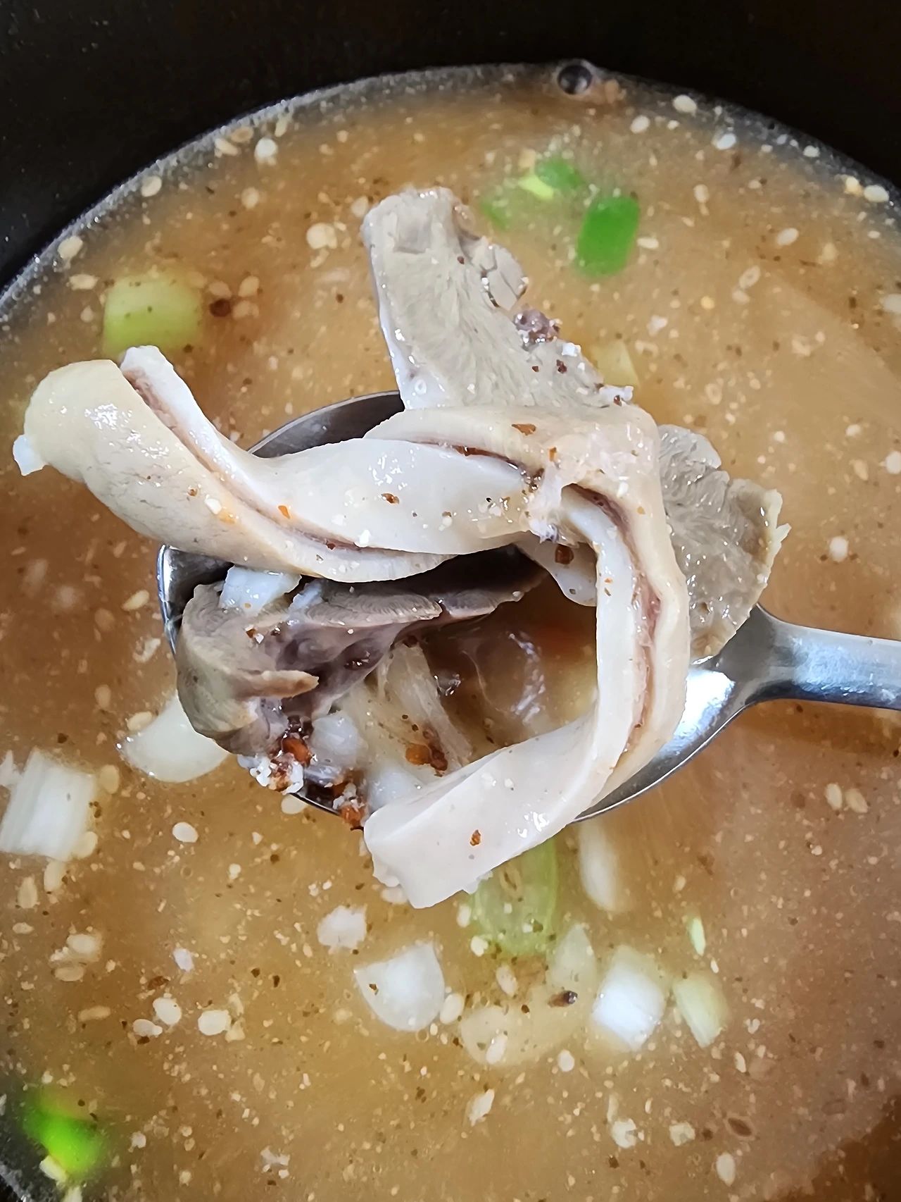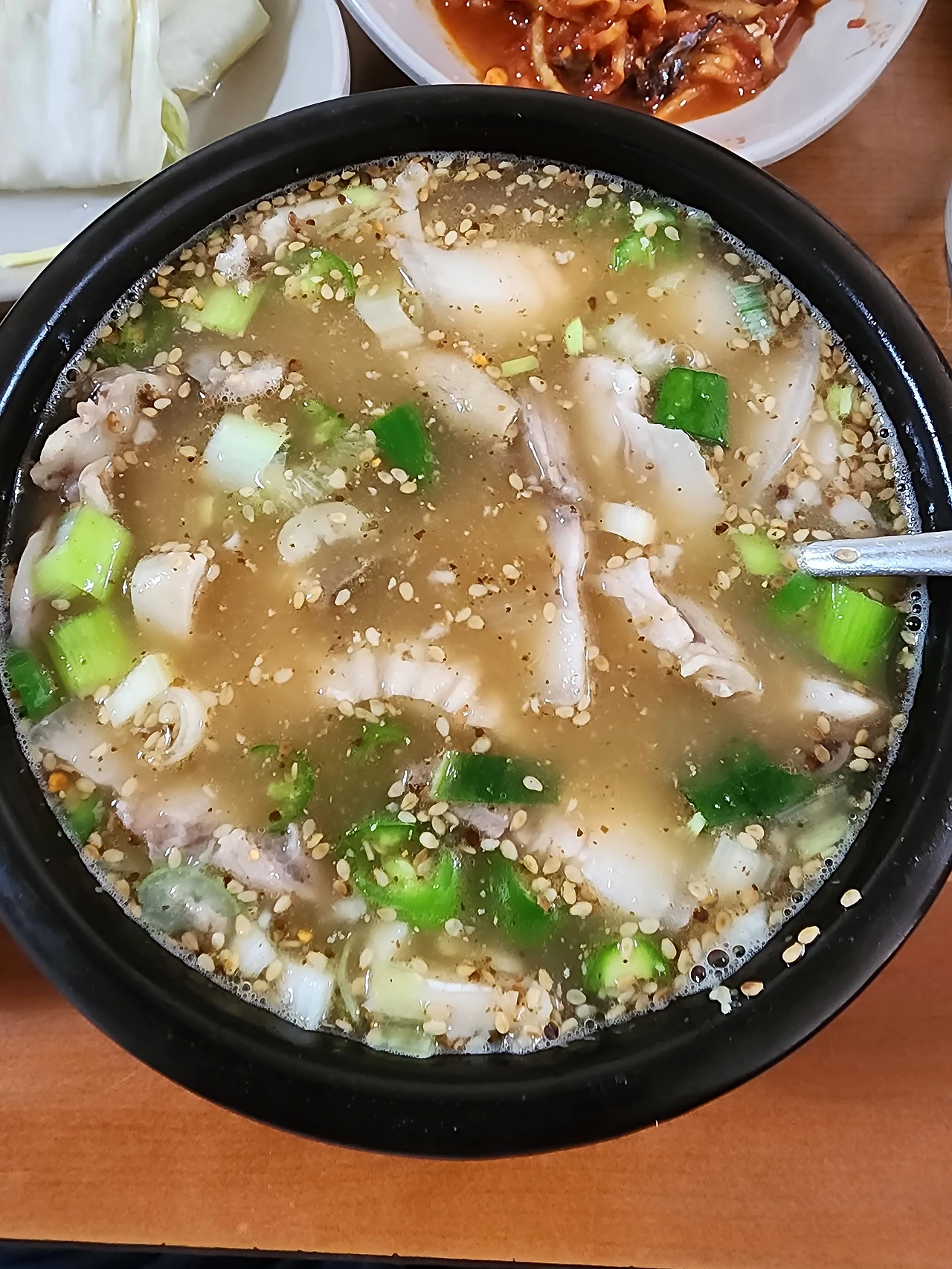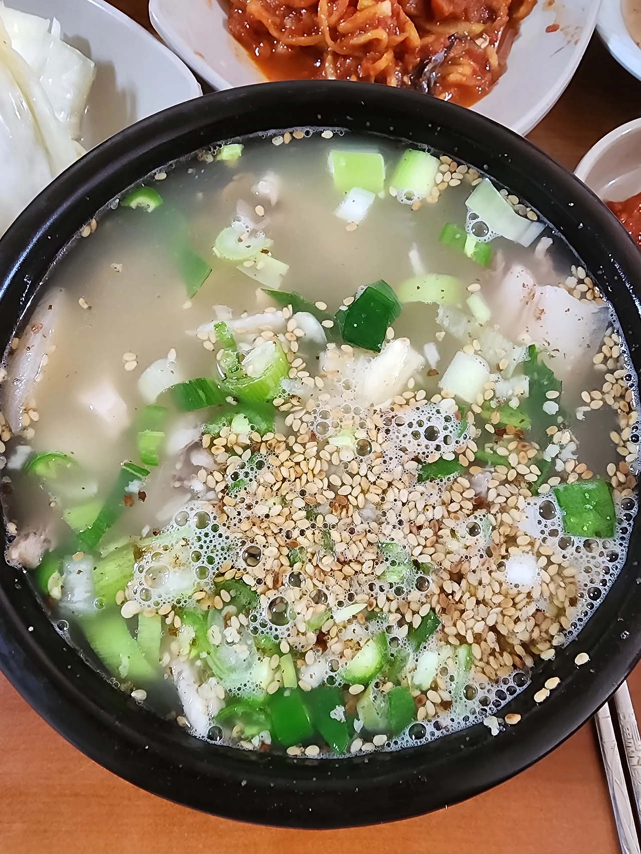 김고로는 들깨와 참깨, 파, 청양고추가 가득 다져서 들어간 맑은 국밥을 한두 숟갈 먼저 맛본다. 맑고 깔끔하며 진한 맛이 입안에 가득하다, 깨들이 많이 얹어져서 그런지 고소한 풍미가 있다.